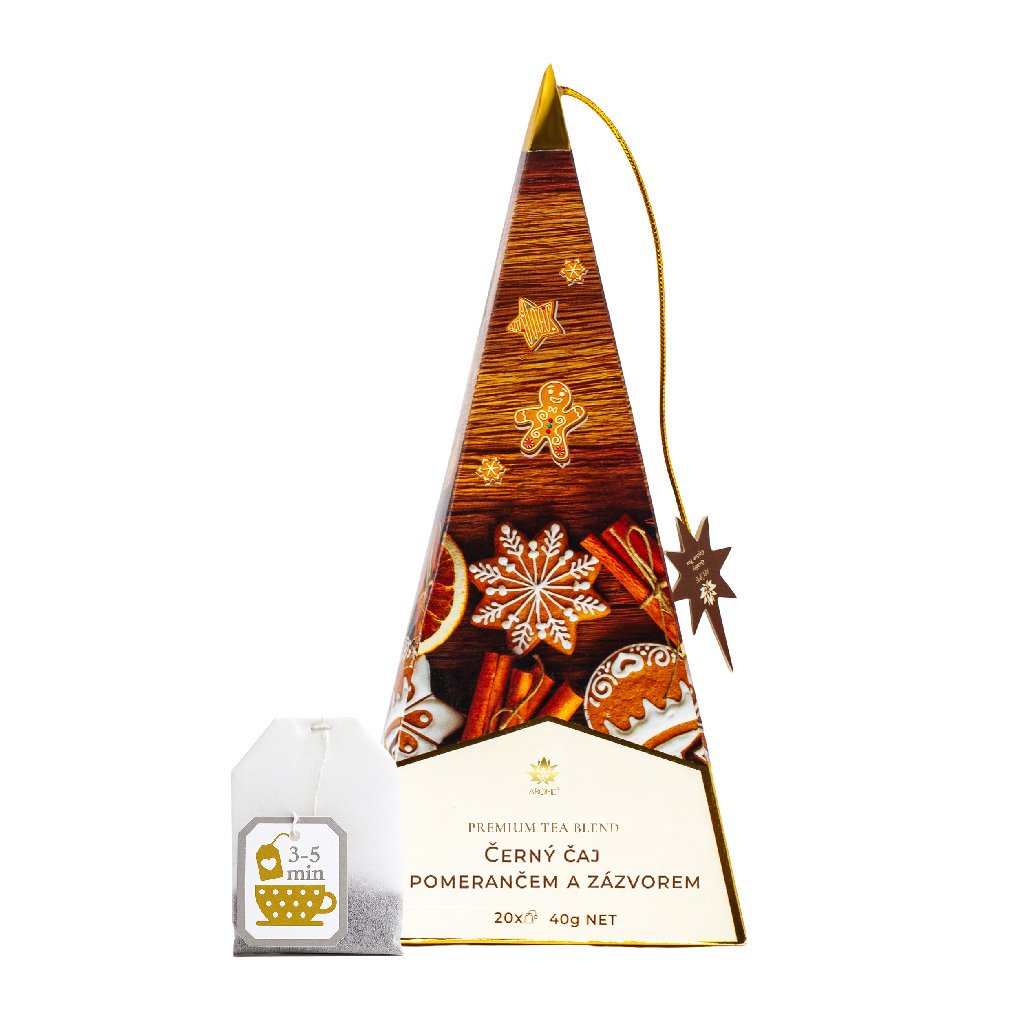20 čajových vrecúšok s lahodným čiernym čajom s príchuťou pomaranča a zázvoru je zabalených v krásnej dizajnovej pyramíde s vianočným motívom zdobených perníkov.