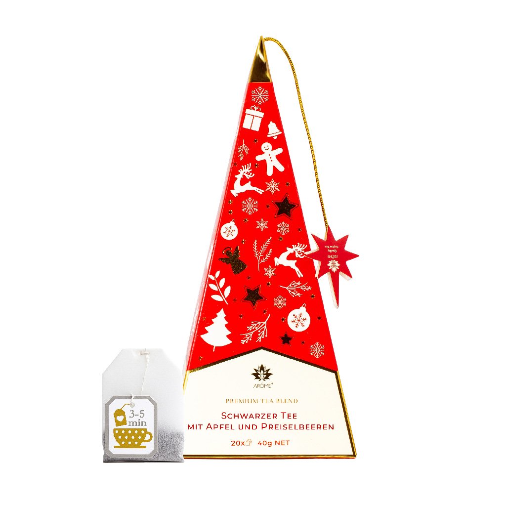 20 čajových vrecúšok s lahodným čiernym čajom zo Srí Lanky, ochuteným jemnou kombináciou jablka a brusnice, je zabalených v elegantnej dizajnovej pyramíde s vianočným motívom.