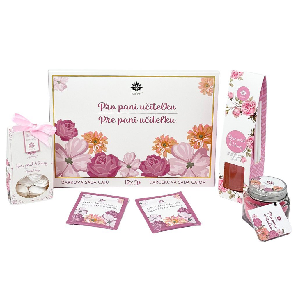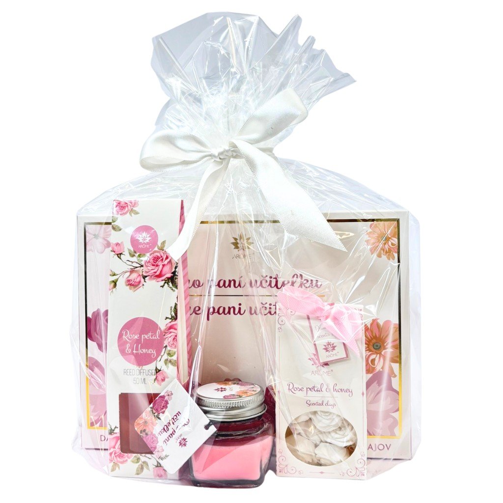 Na konci školského roka je milé poďakovať pani učiteľke za jej čas a trpezlivosť. Pripravili sme pre vás výber rôznych darčekových balíčkov. Tento darčekový set obsahuje milú pozornosť v podobe vonnej sviečky, vonných ílov, tyčinkového difuzéra a sady čajov. Všetko zabalené v celofáne s mašľou.