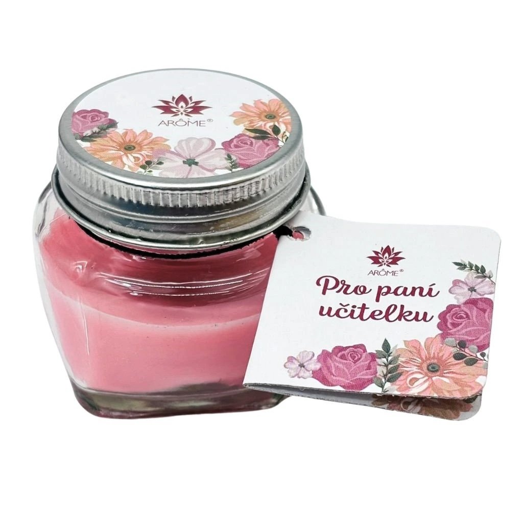 Vonná sviečka v skle s cedulkou „Pre pani učiteľku“; vôňa orchidea. Doba horenia 8 hodín.