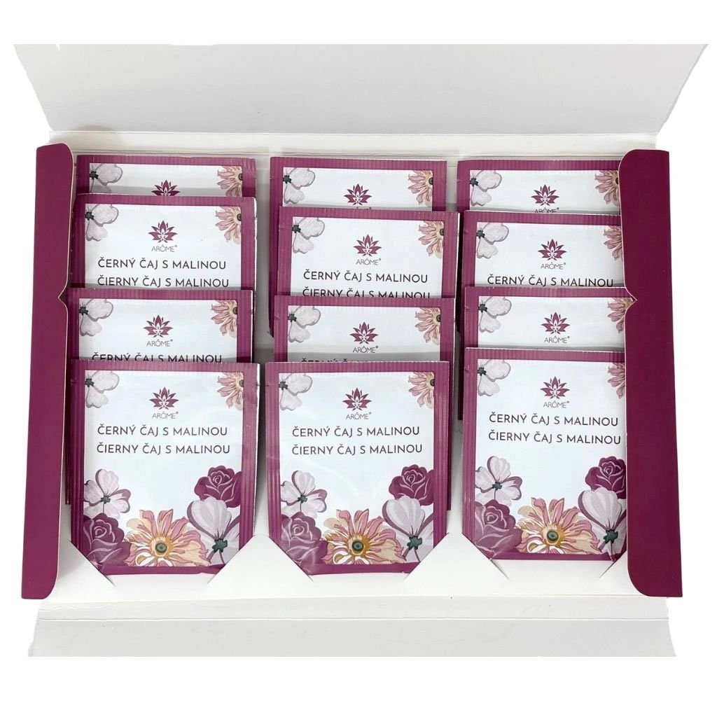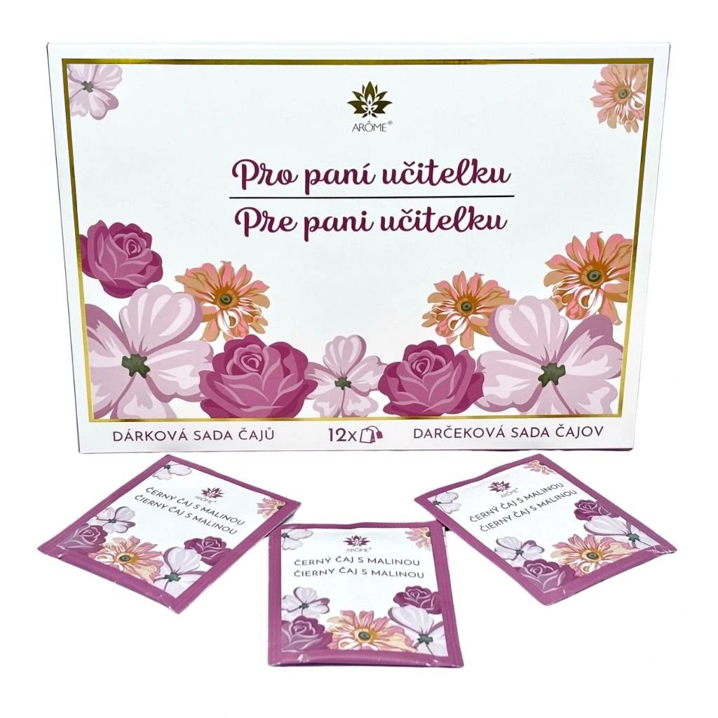 12 čajových sáčkov zabalených do krásnej obálky s nápisom „Pre pani učiteľku“. Čierny čaj s príchuťou maliny.