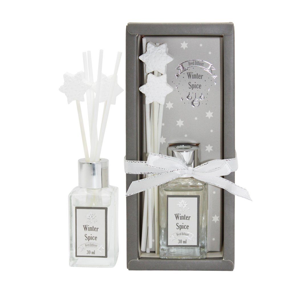Bielo-strieborné elegantné balenie aroma difuzéra značky ARÔME so štyrmi tyčinkami a dvoma dekoratívnymi vonnými ílmy v tvare snehovej vločky pripomína zimu a difuzér nesie aj názov Winter Spice (Zimné korenie). 30 ml.