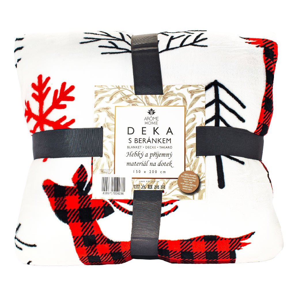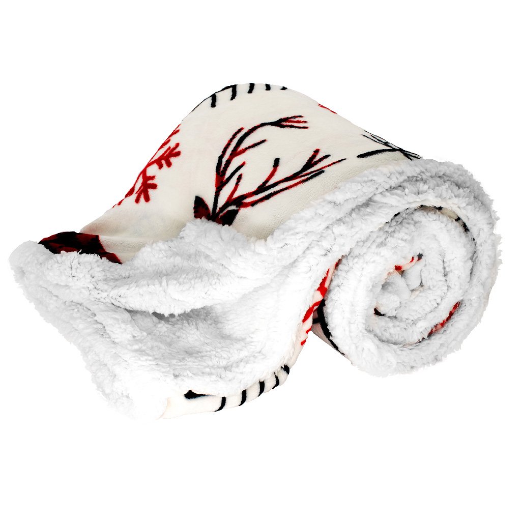 Táto mikroflanelová deka s baránkom je ladená do zimného a vianočného štýlu. Na bielej ploche vynikajú červené vločky, vetvičky a siluety sobov v červeno-čiernom károvanom vzore. Pôsobí hrejivo, tradične a hodí sa ako do obývačky, tak do detskej izby alebo ako vianočný darček.