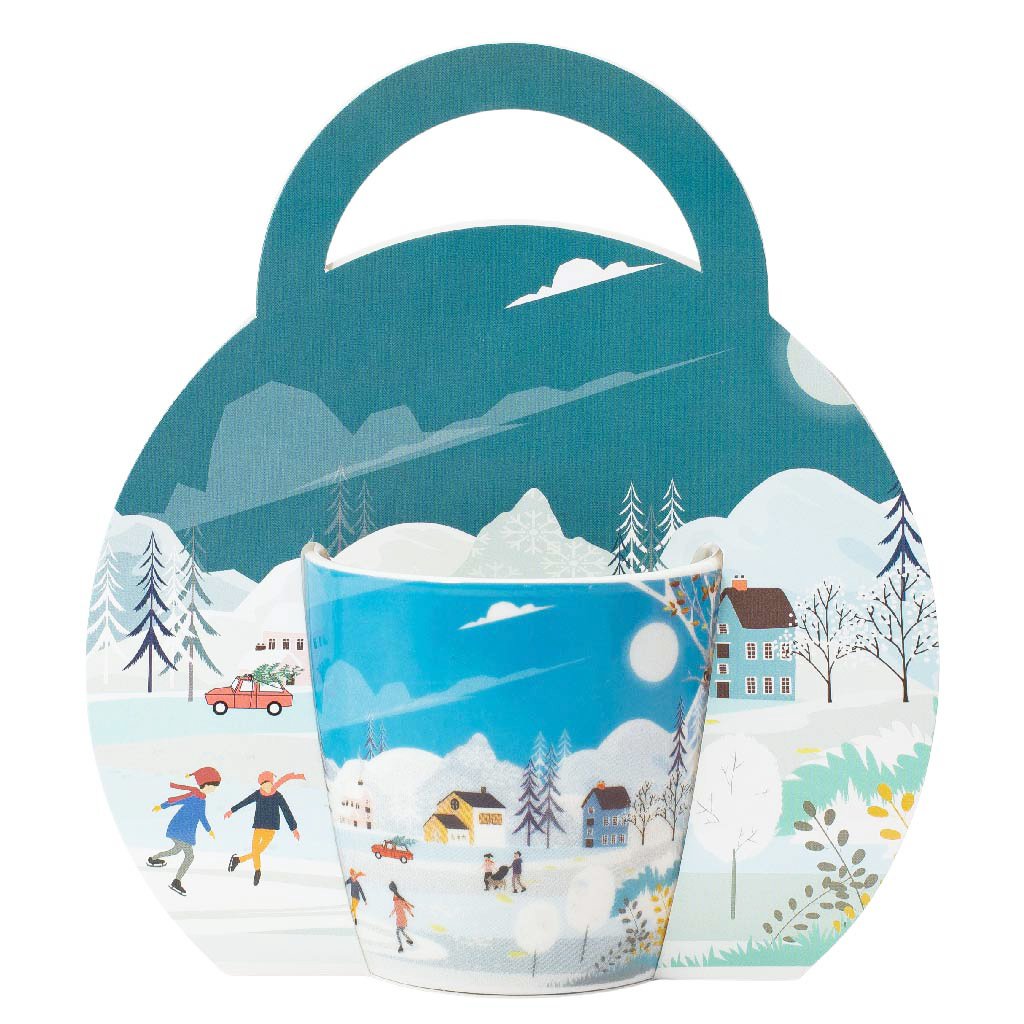 Vychutnajte si horúci čaj, kávu alebo kakao z tohto kúzelného porcelánového hrnčeka s pôvabným zimným motívom. Na ilustrácii sa odohráva veselá scéna korčuľovania na zamrznutom rybníku, obklopená zasneženou krajinou, chalúpkami a zimnou atmosférou.