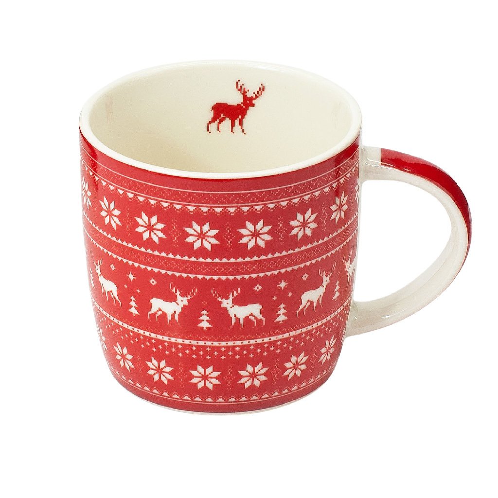 Štýlový porcelánový hrnček v sýto červenej farbe zdobí biely zimný vzor inšpirovaný tradičným nórskym svetrom – s motívmi vločiek a sobov. Tento nadčasový dizajn prináša útulnú atmosféru severu a je ideálny na zimné chvíle s horúcim čajom, kávou či kakaom.