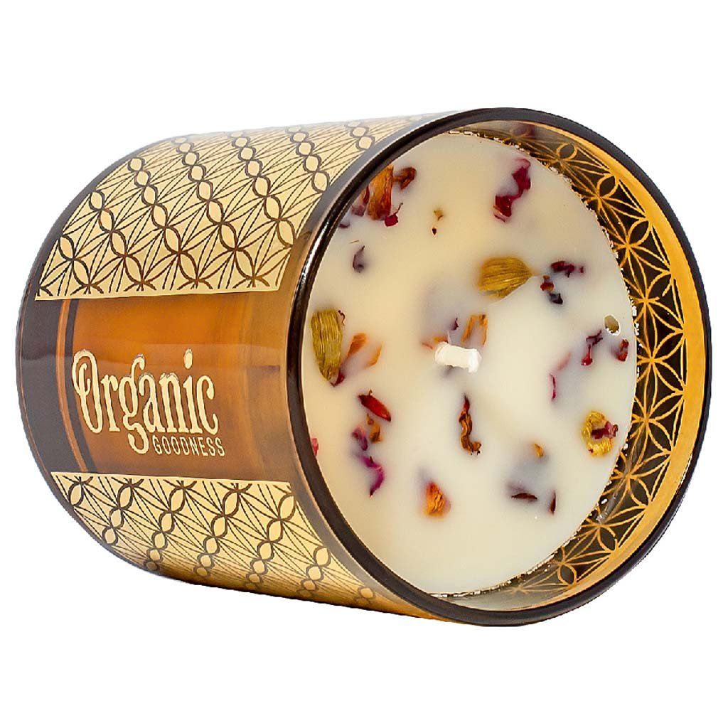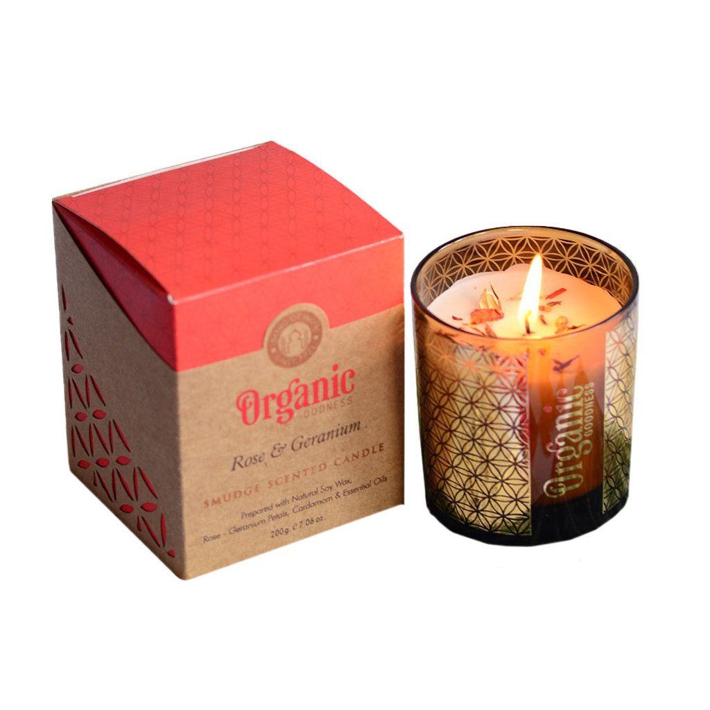 Sójové sviečky Organic Goodness sú vďaka použitým esenciálnym olejom vhodné na aromaterapiu a relaxáciu. S očarujúcou vôňou prírodných olejov z pravej ruže a pelargónie zakončenou okvetnými lístkami ruže.