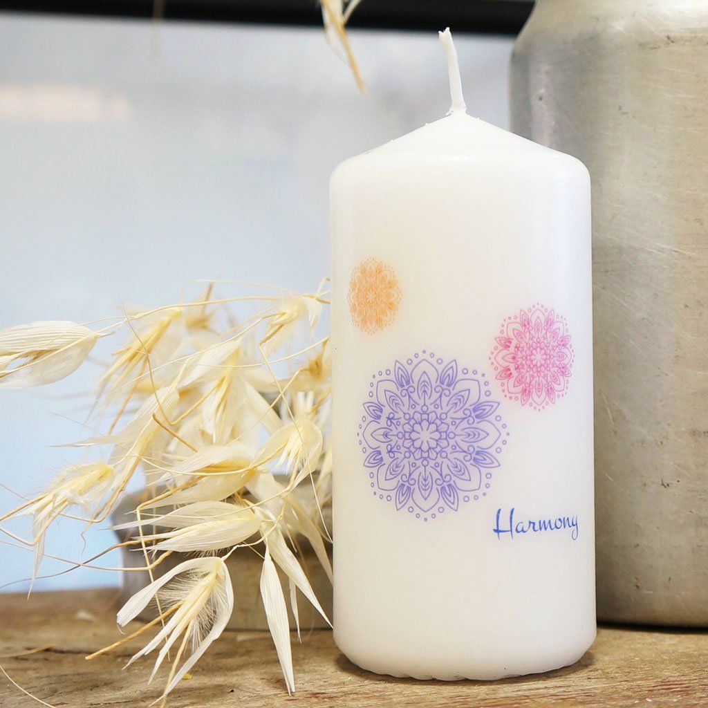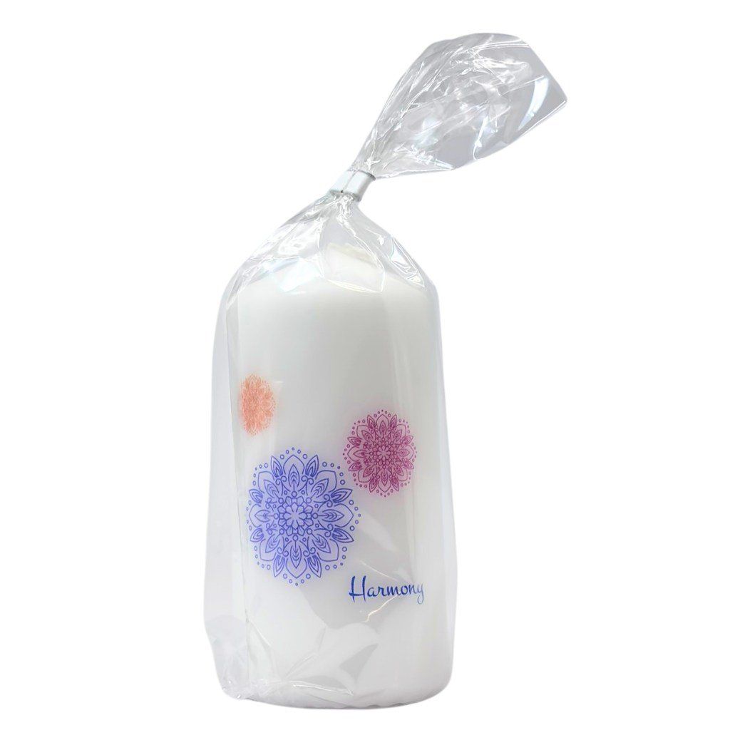 Elegantná biela sviečka s jemnou potlačou mandál a nápisom Harmony je ideálna pre chvíle pokoja a pohody. Vďaka svojmu jednoduchému dizajnu sa hodí do každého interiéru – či už ako dekorácia alebo súčasť darčekového balíčka.