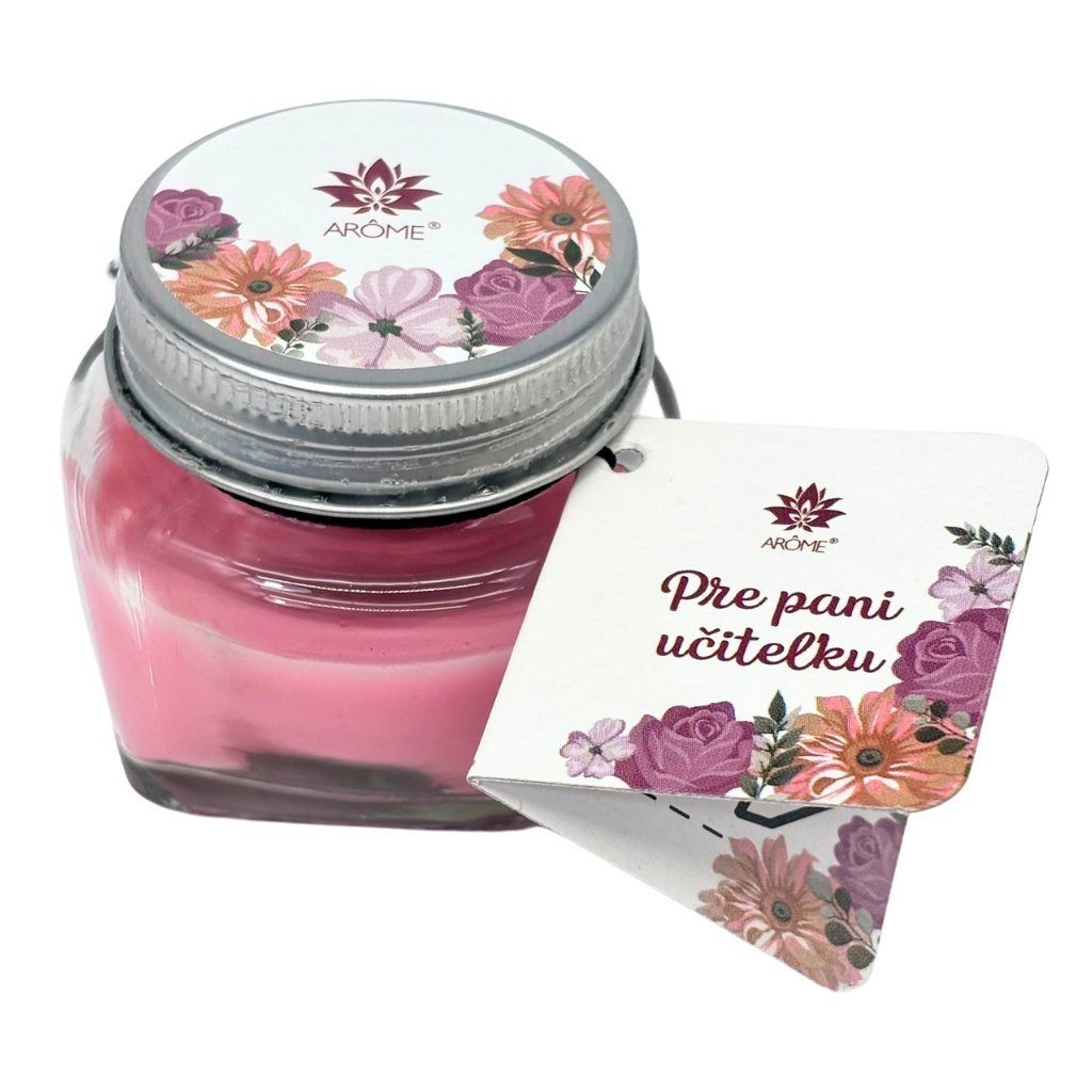 Máme pre vás ideálny darček či pozornosť pre obľúbenú pani učiteľku. Vonná sviečka v sklenenej nádobe s viečkom a visačkou so slovenským nápisom „Pre pani učiteľku“.