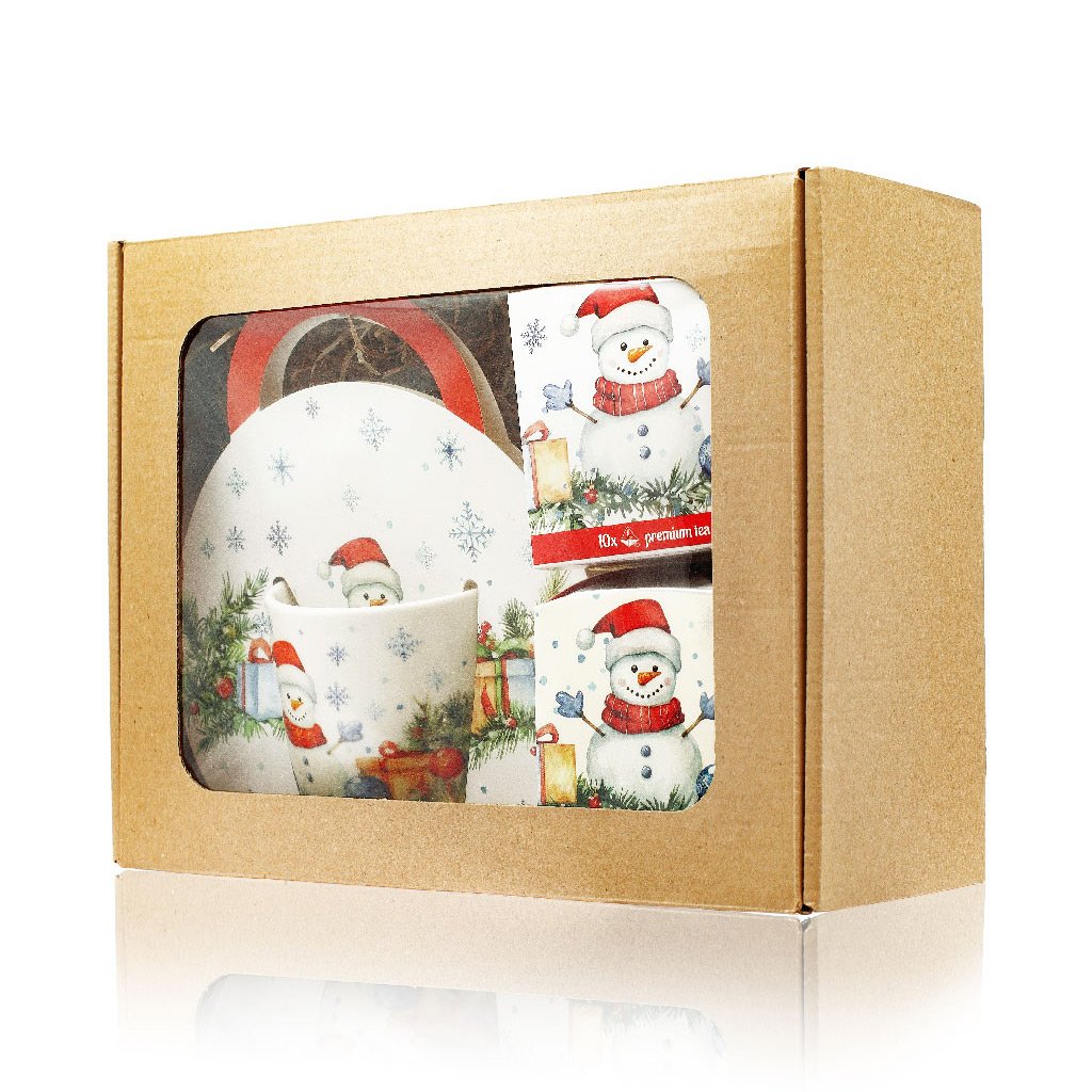Vytvorte si doma pravú sviatočnú atmosféru s vianočnou sadou, ktorá poteší zmysly aj srdce. Štýlový porcelánový hrnček NEW BONE CHINA s veselým motívom snehuliaka, prémiový čaj zo Srí Lanky v dvoch zimných príchutiach a sviečka s vôňou Vianoc – všetko v jednotnom dizajne, krásne darčekovo zabalené. Ideálne ako darček pre rodinu, priateľov aj kolegov.