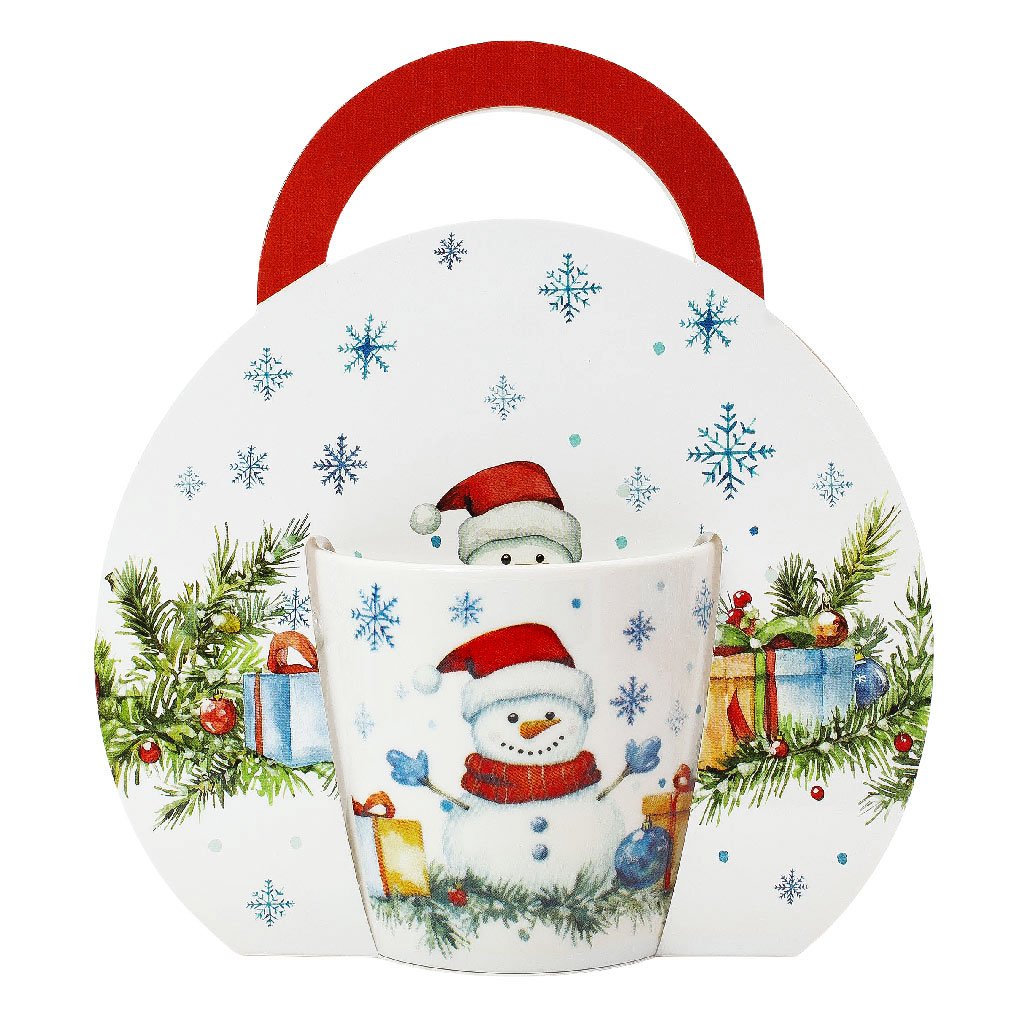 Porcelánový hrnček (cca 300 ml) – z kvalitného kostného porcelánu New Bone China, s hravým motívom snehuliaka, darčekov a vločiek. Umiestnený v kartónovej taške s uškom v rovnakom dizajne, pripravený na okamžité darovanie. Vhodný do mikrovlnnej rúry aj umývačky riadu.
