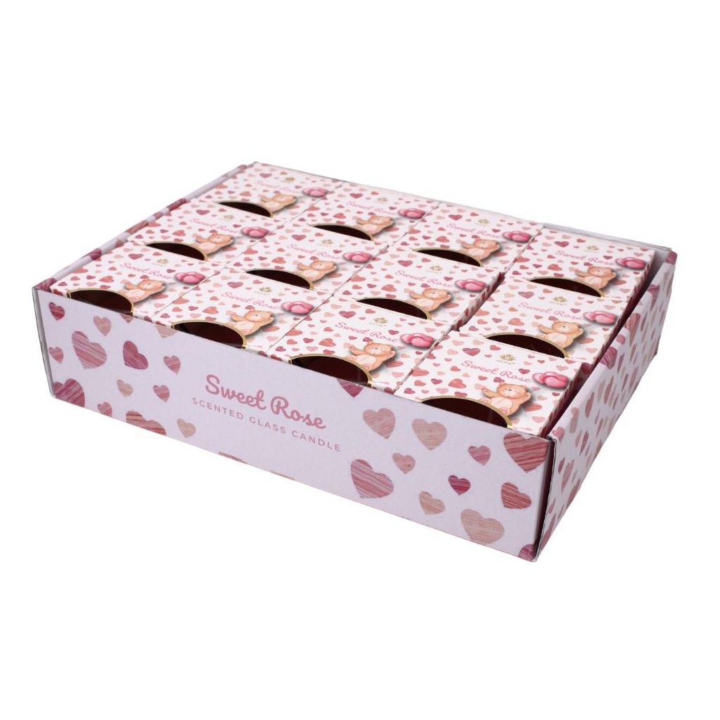 Balená vo farebnej papierovej škatuľke. Vonná sviečka Sweet Rose môže byť skvelým darčekom.