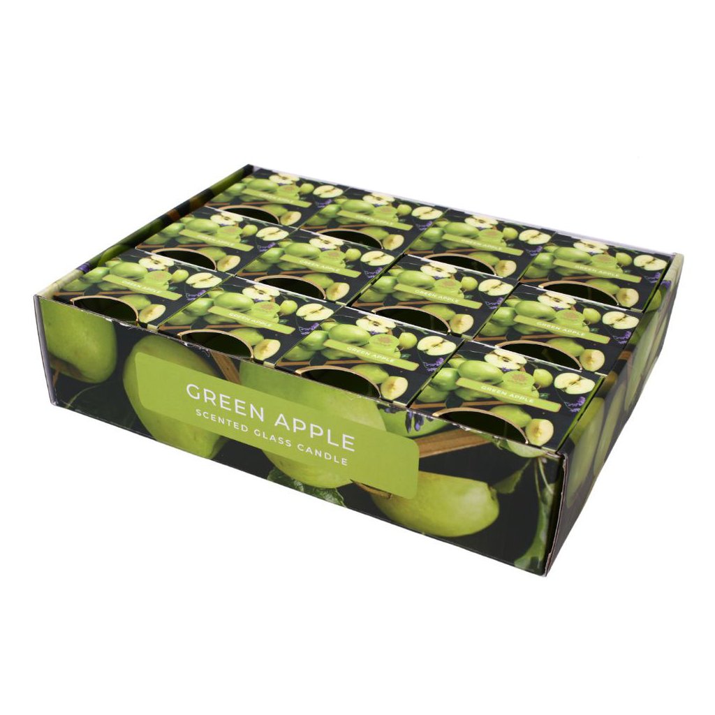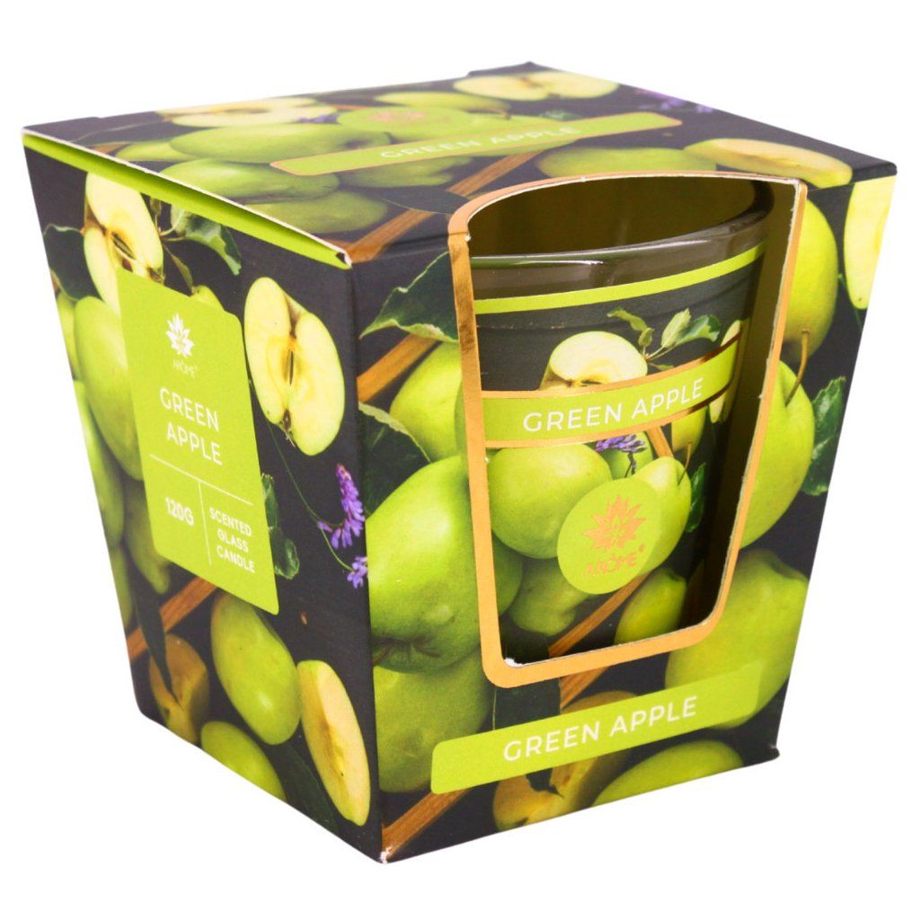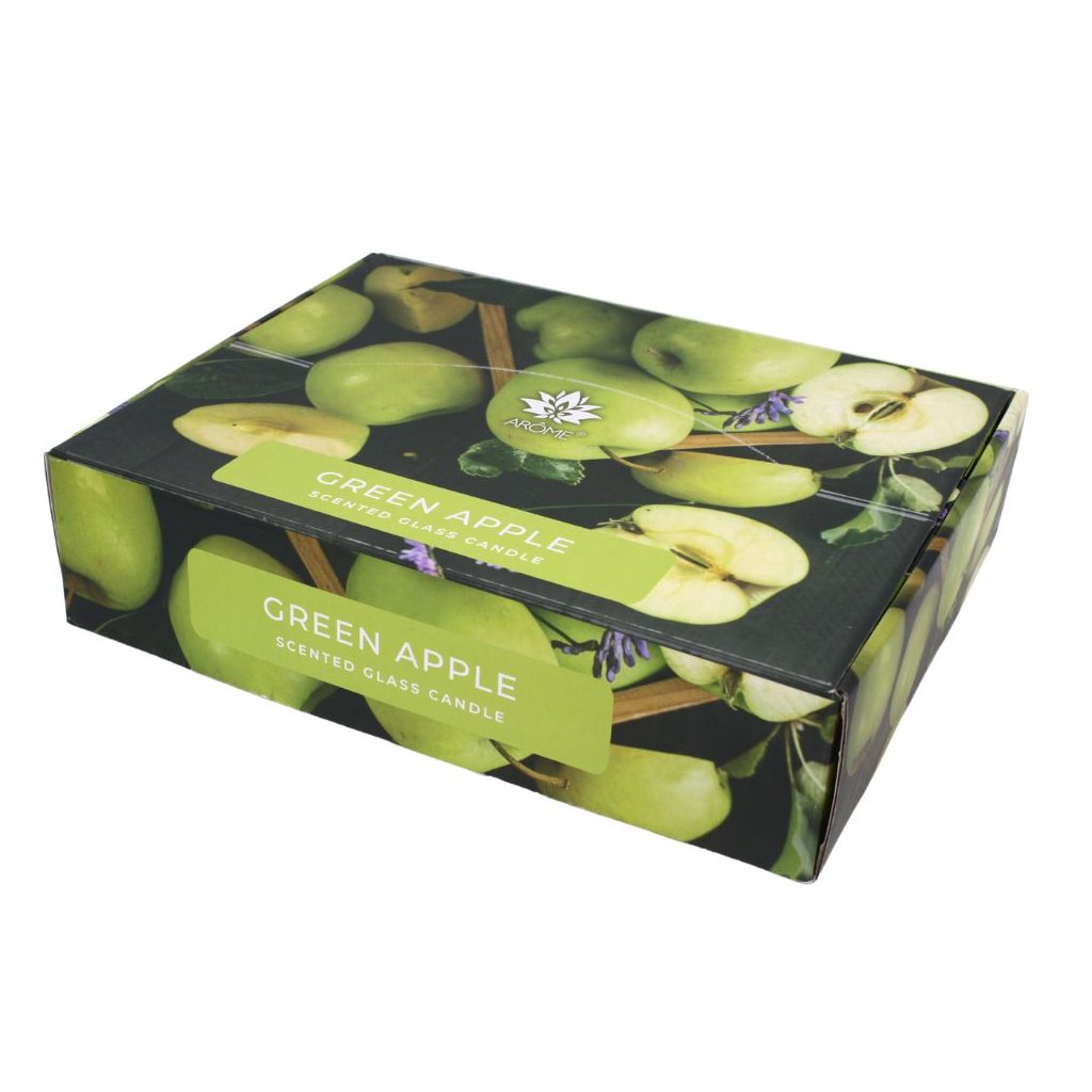 Balená vo farebnej papierovej škatuľke. Vonná sviečka Zelené jablko môže byť skvelým darčekom.