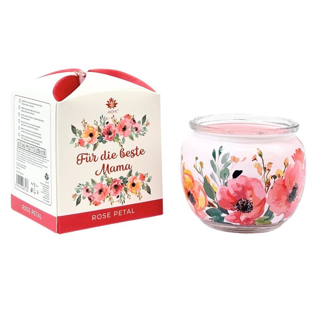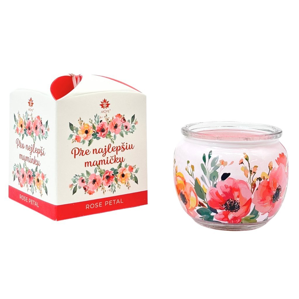 Vonná sviečka v skle s vôňou okvetných lístkov ruží (Rose Petal),90 g. Balené v krásnej darčekovej škatuľke s vekom v tvare kvetu a nápisom "Pre najlepšiu babičku".