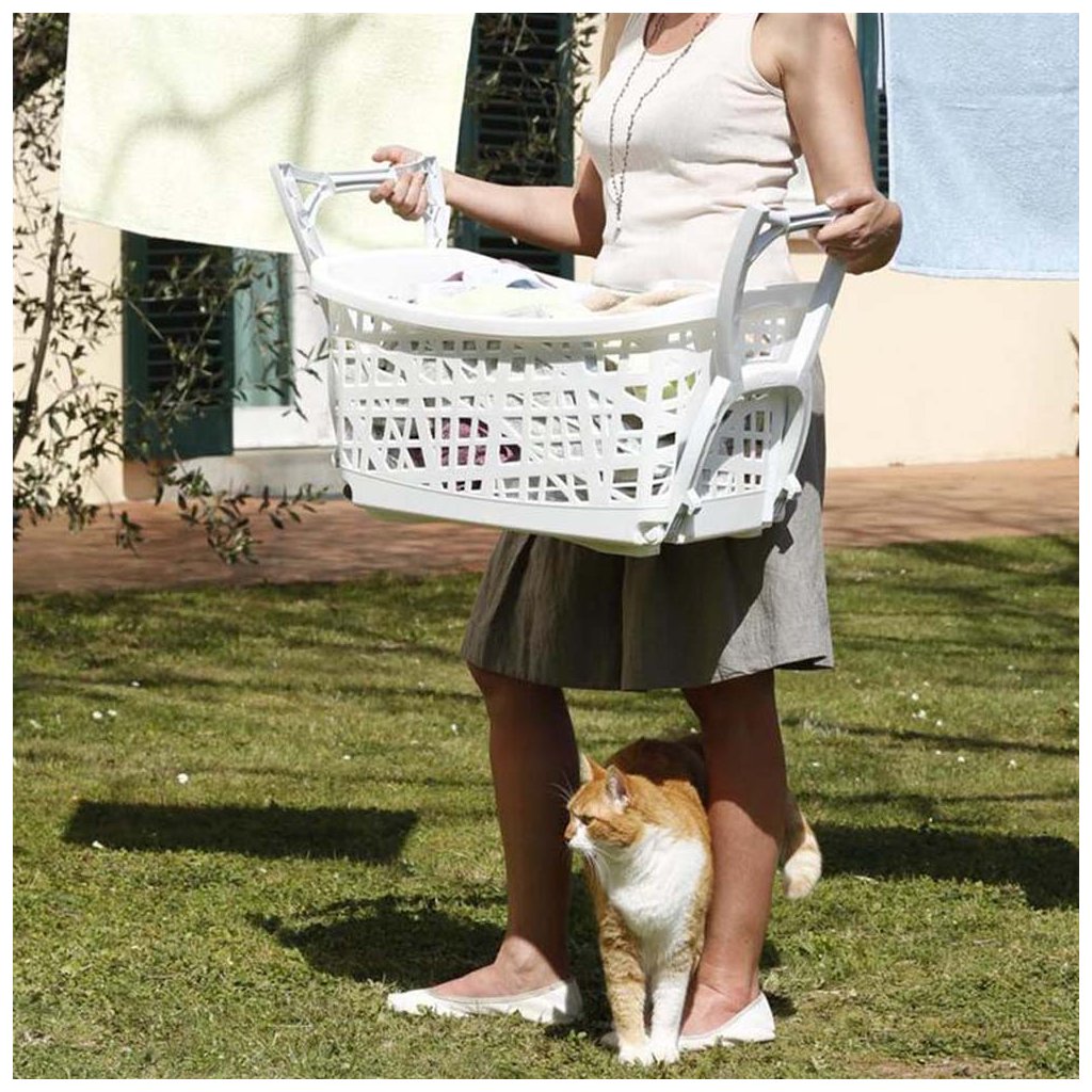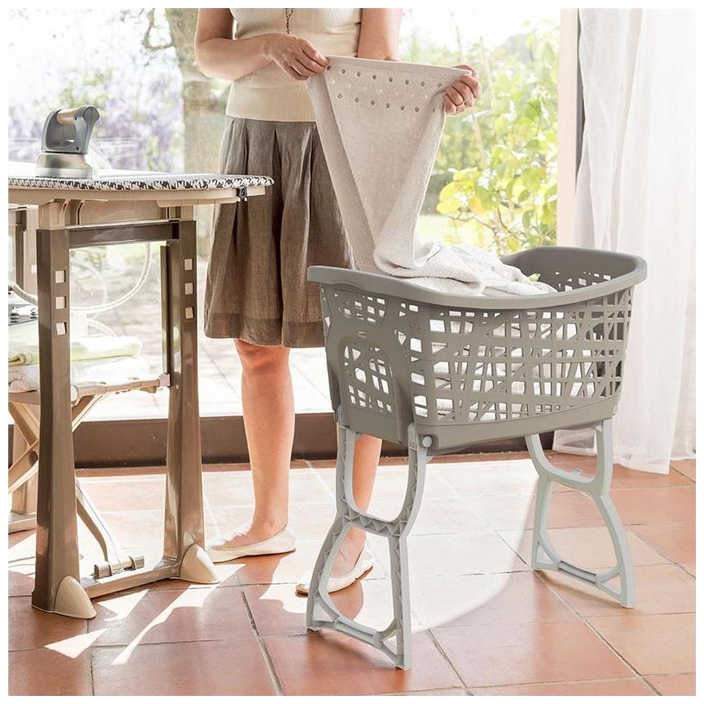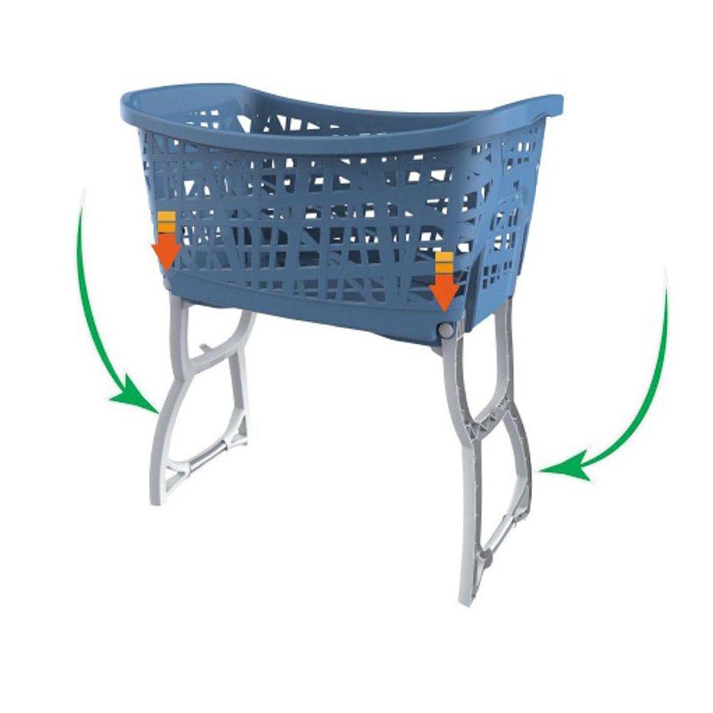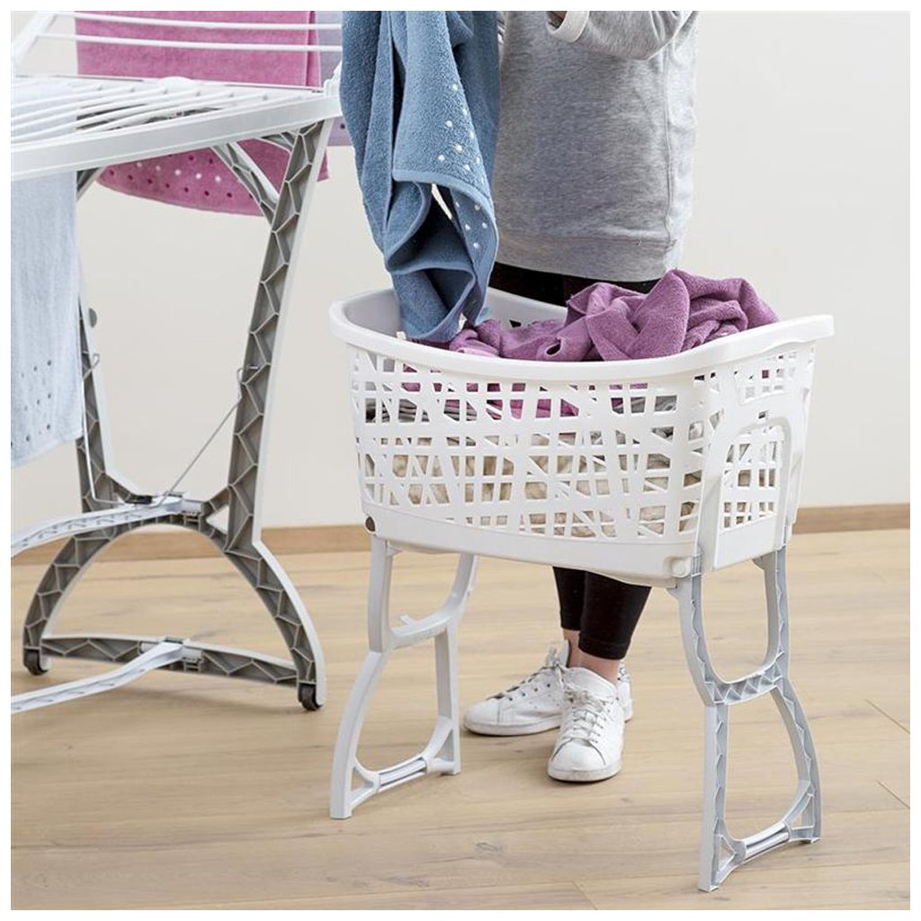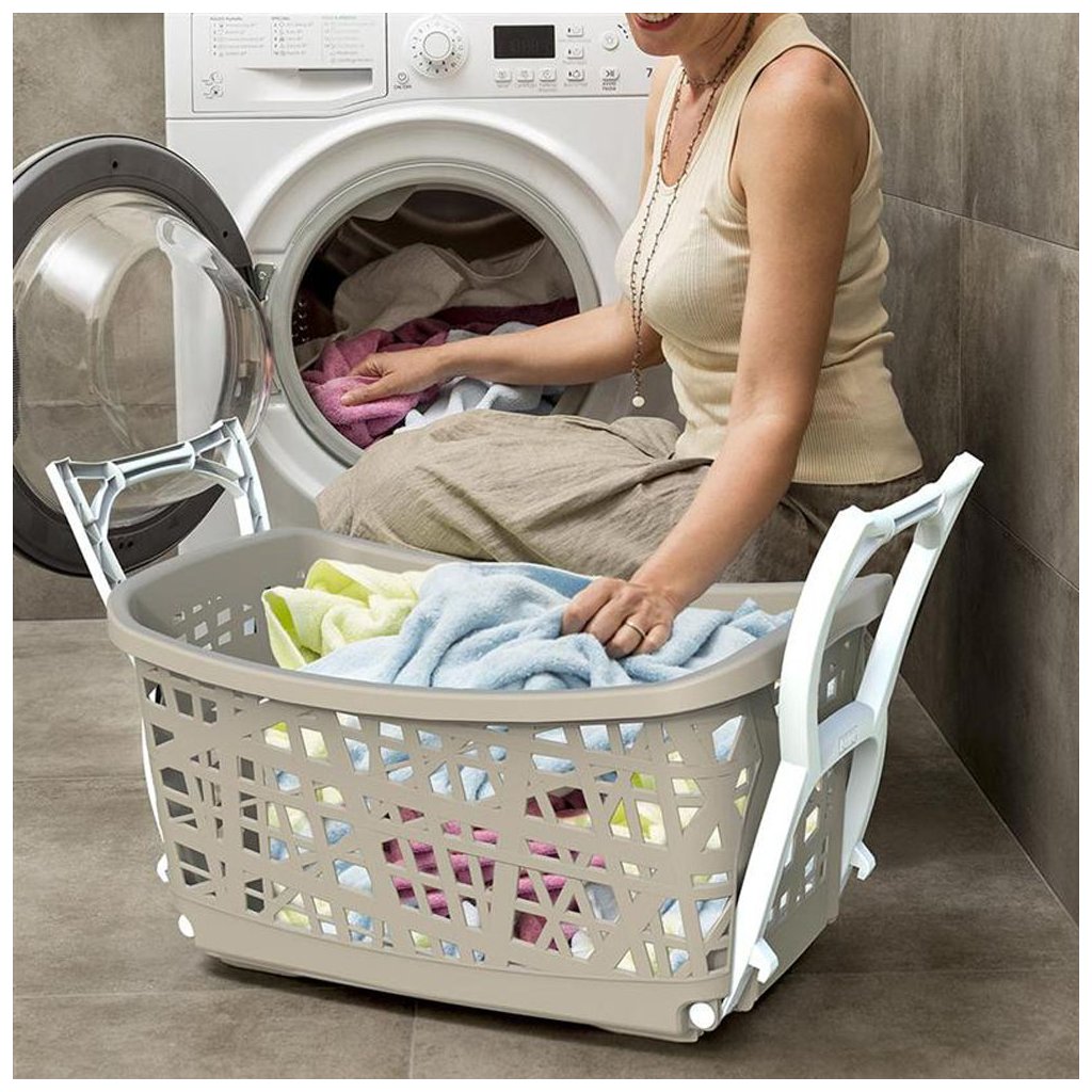 Pohodlný praktický kôš na bielizeň so sklopnými nožičkami. Tie slúžia buď na zdvihnutie koša do výšky, alebo sa dajú jednoduchým pohybom zmeniť na pevné držadlá na jednoduché prenášanie koša.