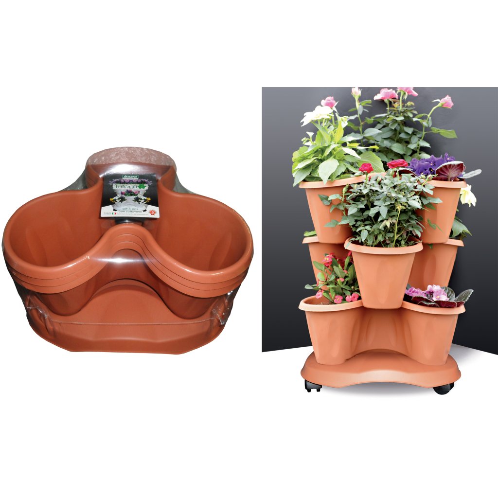 Sada 3 kvetináčov v tvare trojlístka TRIFOGLIO vás bude inšpirovať k vytváraniu kompozícií farebných kvetov, pestrofarebných byliniek alebo jahôd na viacerých úrovniach. Zaujímavý tvar umožňuje stabilné uloženie jednotlivých nádob na seba. Spodná misa je vybavená kolieskami na ľahké premiestňovanie.