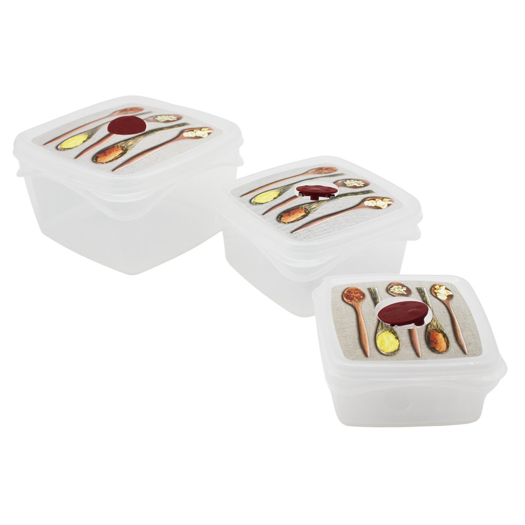 Sada 3 plastových dóz na potraviny s kvetinovým viečkom a špeciálnym odvzdušňovacím ventilom.