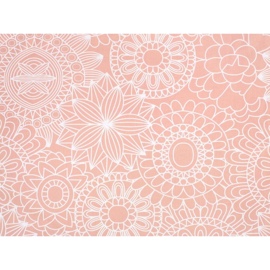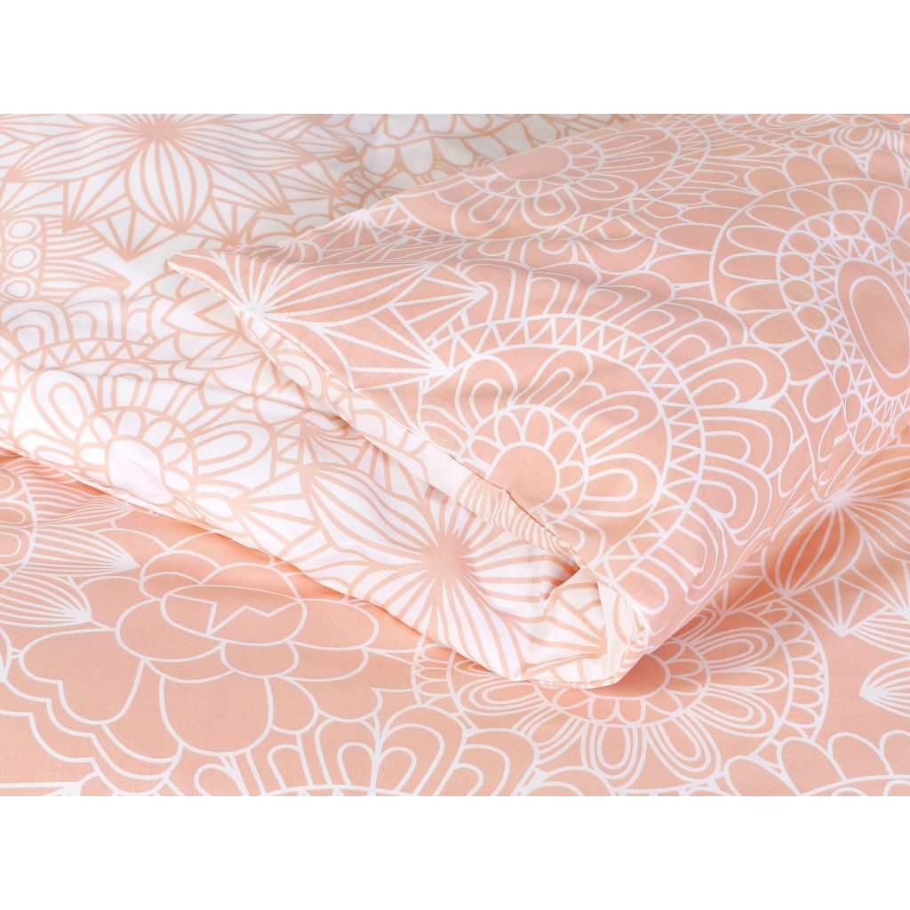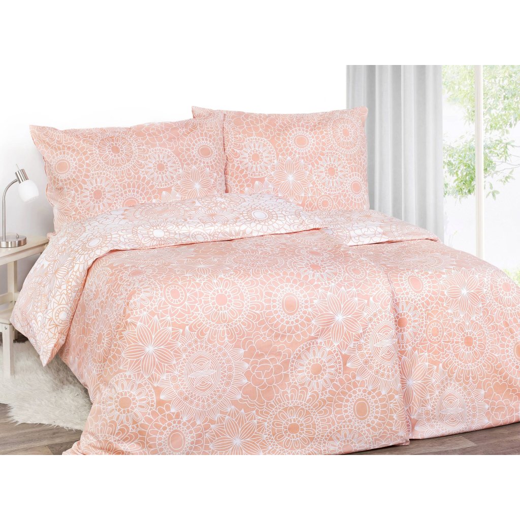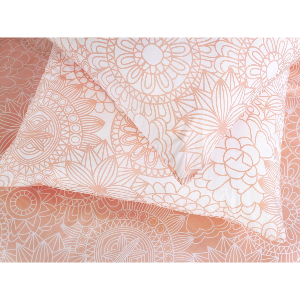 Vneste do svojej spálne harmóniu a štýl s obojstrannou bavlnenou posteľnou bielizňou zdobenou jemnými mandalami v bielych a lososových odtieňoch. Táto posteľná bielizeň je vyrobená z kvalitnej, husto tkanej bavlny, je príjemne mäkká, priedušná a jemná k pokožke, čo zaručuje pohodlný spánok. Vzor elegantných mandál v kombinácii bielej a lososovej farby dodáva posteľnej bielizni moderný a zároveň upokojujúci vzhľad, ktorý rozžiari každý interiér.