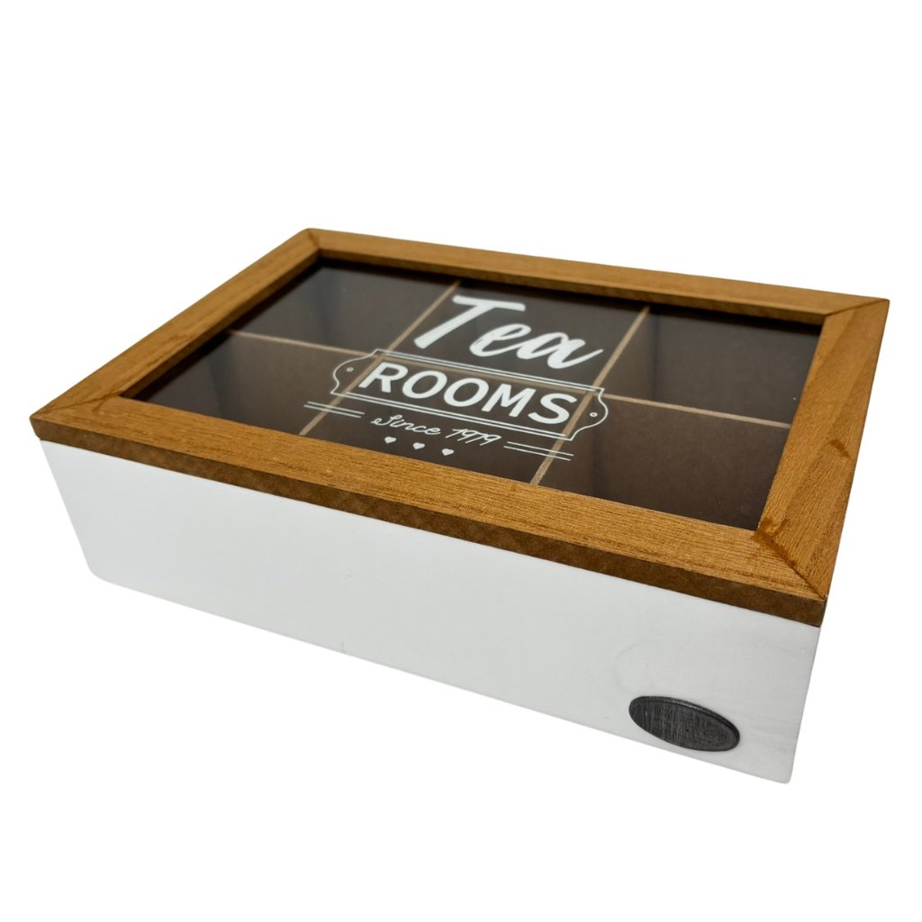 Dóza na čajové vrecúška so šiestimi priehradkami a dreveným vekom so skleneným priezorom, rozmery 24 x 16 x 7 cm, farba biela.