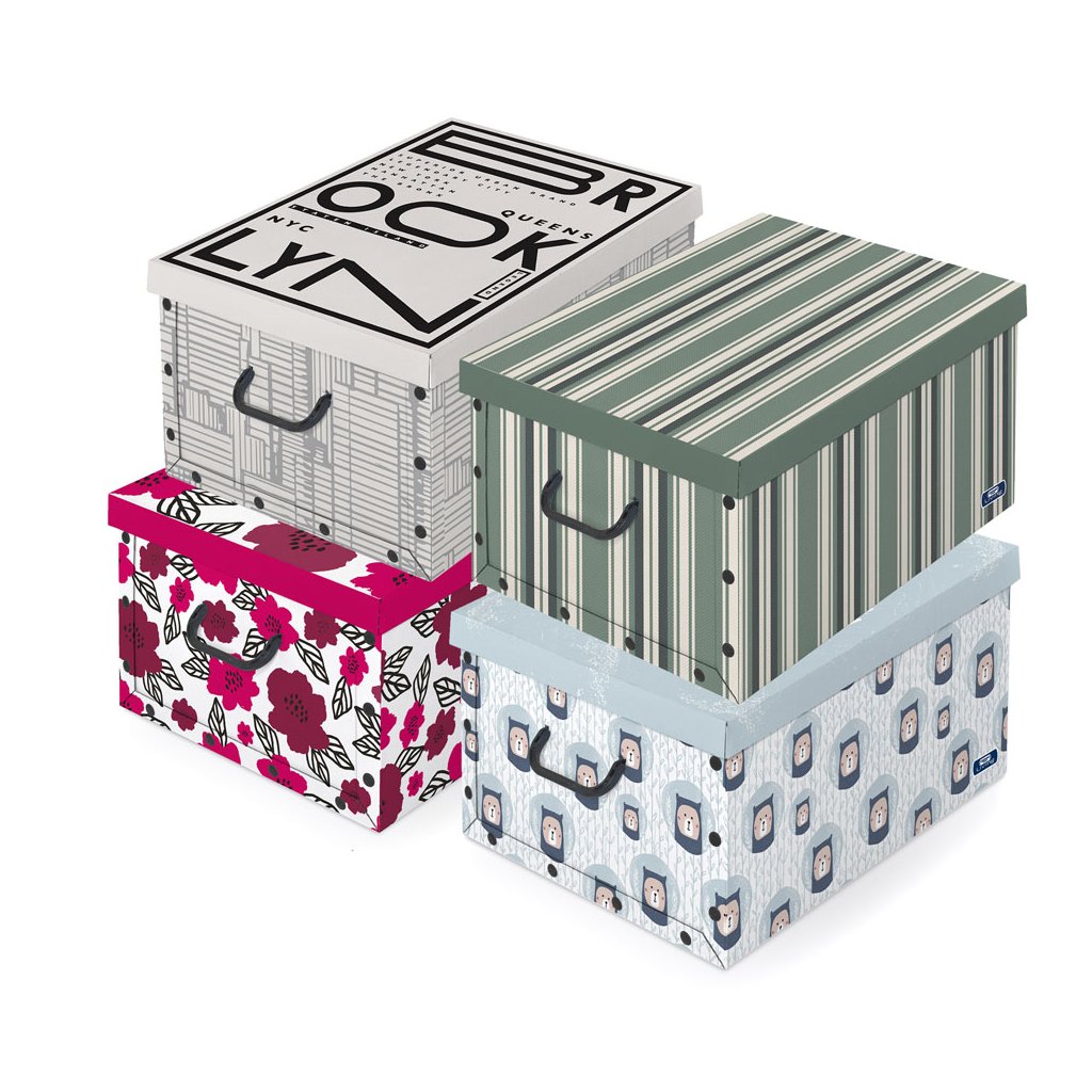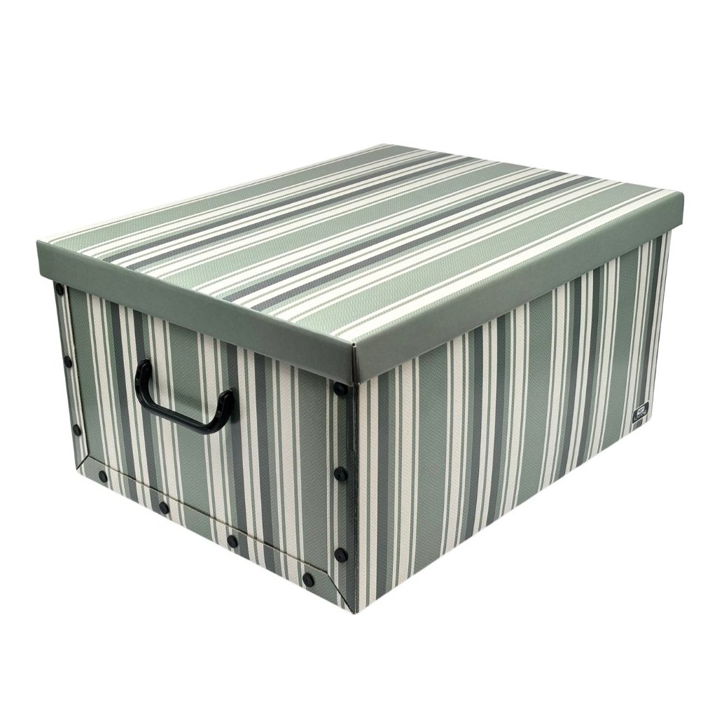 Úložný box s vekom a držadlami s prúžkovaným vzorom, kartón, rozmery 39 x 50 x 24 cm.