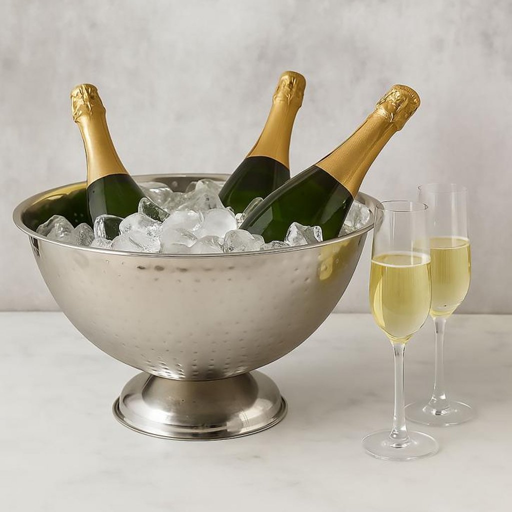 Nádoba má veľkorysý priemer 40 cm, takže pohodlne pojme niekoľko fliaš šampanského, vína alebo iných nápojov s ľadom. Tepaný povrch dodáva štýl a zároveň zabraňuje viditeľným odtlačkom prstov.
