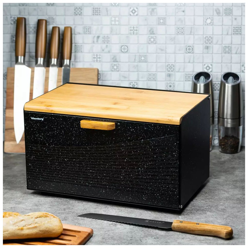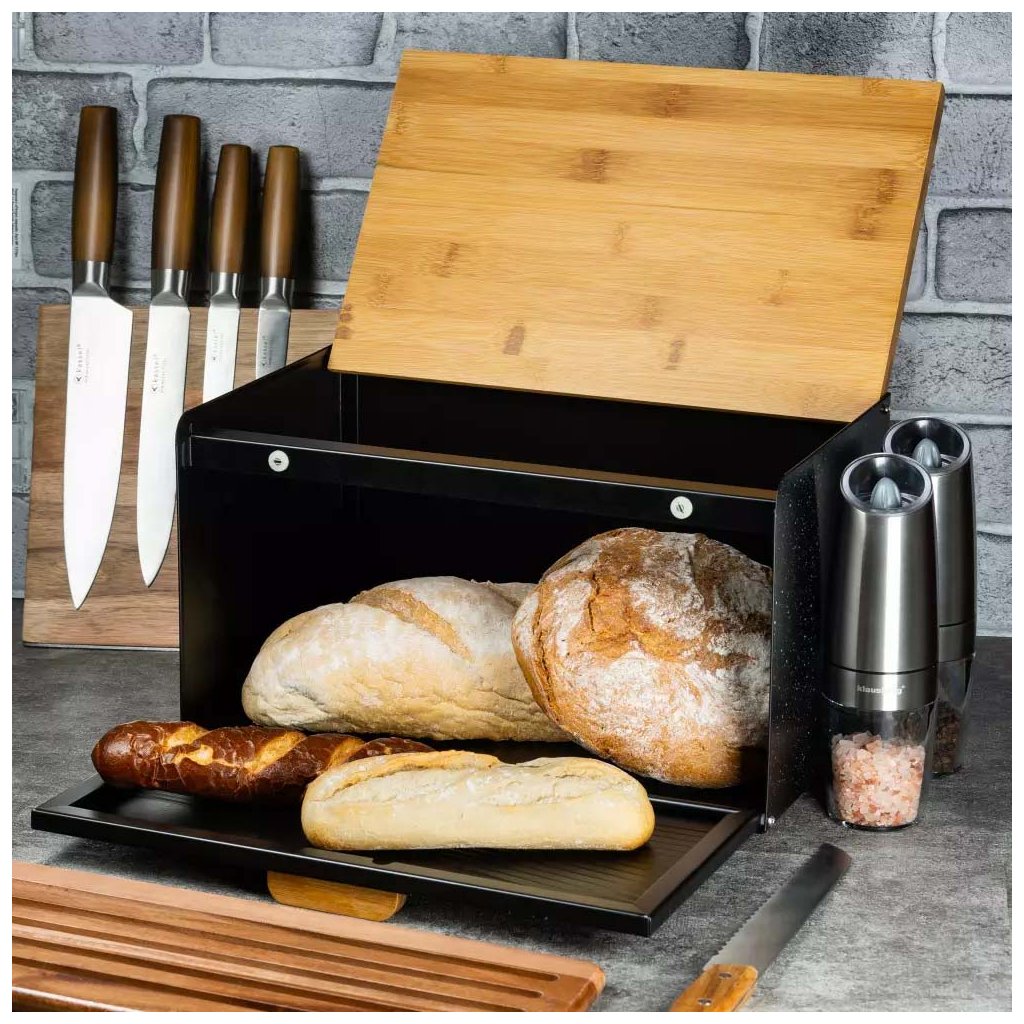 Chlebník je veľký a poskytuje obrovský úložný priestor na uloženie čo najväčšieho množstva chleba. Je vyrobený z hygienických a ekologických materiálov. Je navrhnutý v elegantnej kombinácii čiernej farby a dreva, ktorá sa hodí do interiéru každej kuchyne.