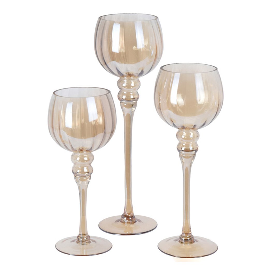 Svietniky sú vyrobené z jemného skla v tvare pohára na stopke. Sú dekoratívnym prvkom do každého interiéru. Súprava 3 kusov - výška 30, 35 a 40 cm.