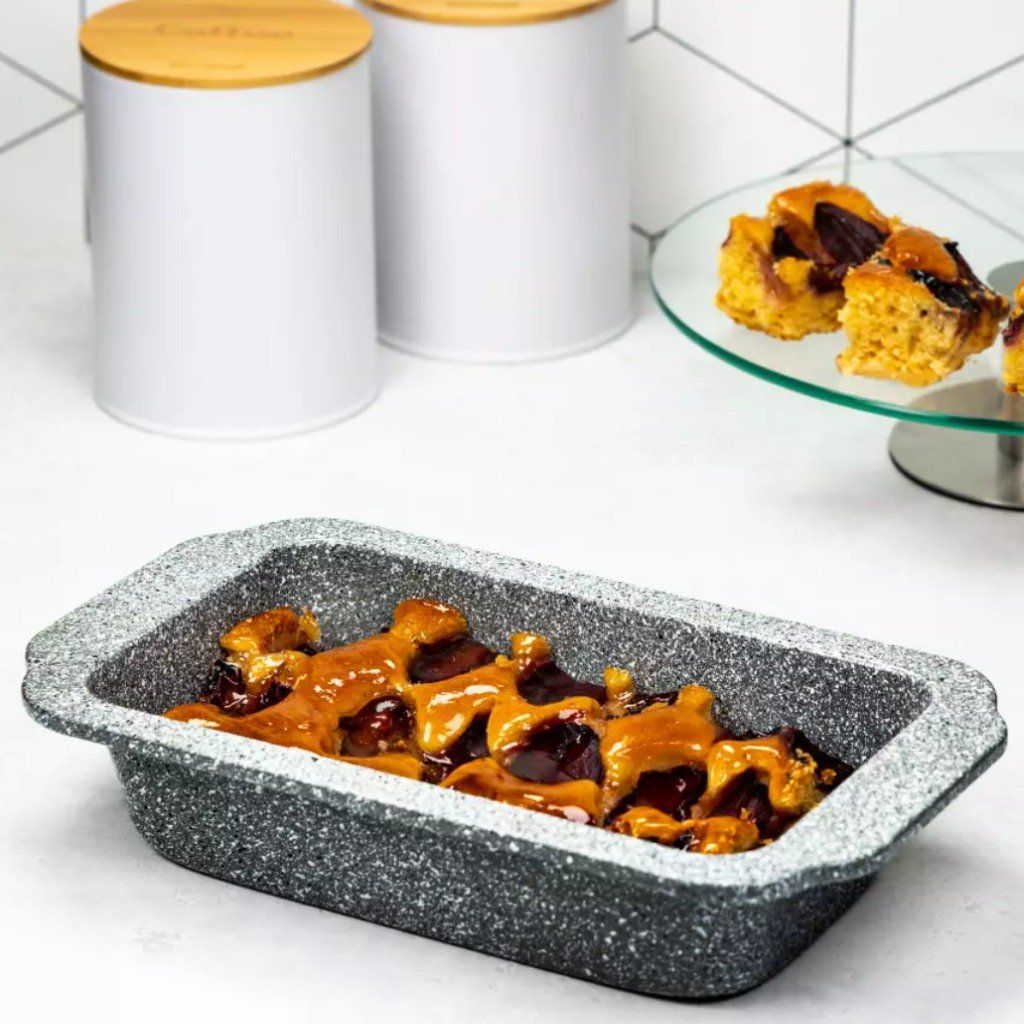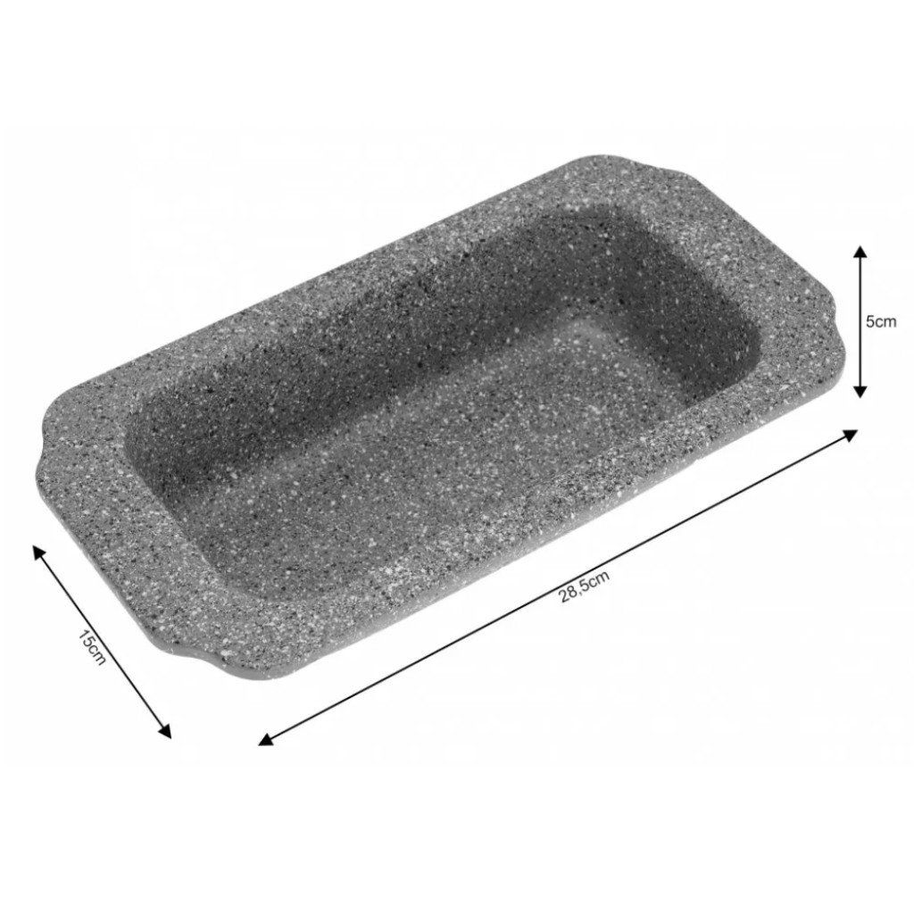 Obdĺžniková forma na pečenie cesta je vyrobená z oceľového plechu pokrytého nepriľnavým granitovým povrchom GRANITE COATING v sivej farbe. Nanesený granitový povlak je mimoriadne tvrdý, ľahko sa nepoškriabe, dokonale chráni pred hrdzavením a predovšetkým uľahčuje proces pečenia. Rovnomerné pečenie je zabezpečené aj vďaka vynikajúcemu rozloženiu tepla.
