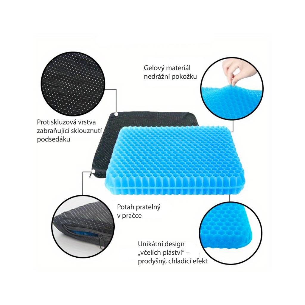 Gélový podsedák poskytuje maximálnu podporu a pohodlie, znižuje tlak na chrbát, kostrč a bedrá a podporuje zdravé držanie tela.