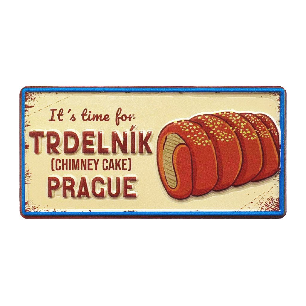 Pevný kovový magnet s rozmerom 4 × 8 cm s veselým motívom tradičného trdelníka a nápisom „It’s time for TRDELNÍK (CHIMNEY CAKE) – PRAGUE“ . Skvele drží na chladničke, magnetickej tabuli aj iných kovových povrchoch.