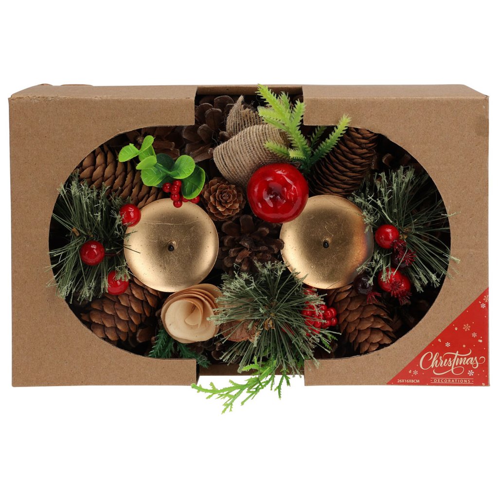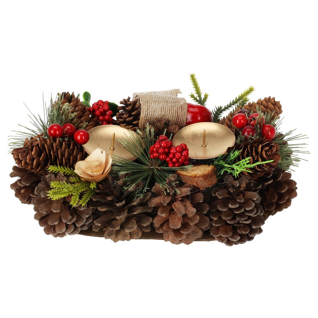 Dekoratívny svietnik je ideálny na vianočný stôl. Sviečka obsahuje dva hroty na voskové sviečky. Sofistikovaný dizajn s pravými šiškami, drevom a červenými umelými bobuľami dokonale doplní adventnú výzdobu vo vašej domácnosti.