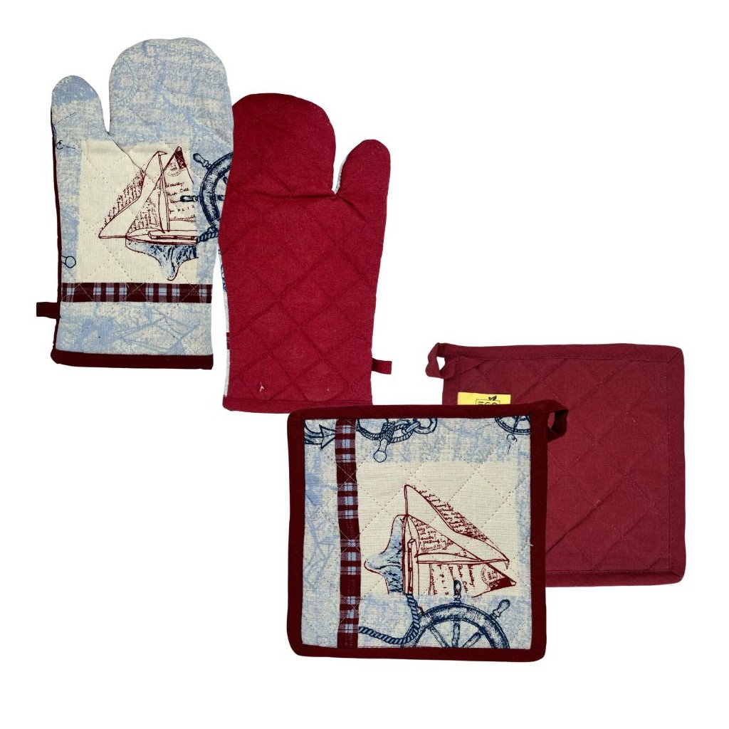 Kuchynská chňapka s magnetom ak tomu podložka z jednej strany námornícke motívy - potlač plachetnice a kormidla, z druhej strany je jednofarebná červená. Dá sa skombinovať s ďalším podobným kuchynským textilom. Všetko môžete mať v rovnakých farbách a s rovnakými motívmi.