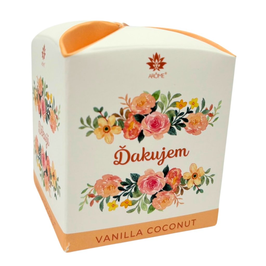 - Vonná sviečka v skle zabalená v krásnej papierovej škatuľke v tvare kvetu s nápisom „Ďakujem“. Hmotnosť 90 g, doba horenia 22 hodín. Vôňa vanilky a kokosu.