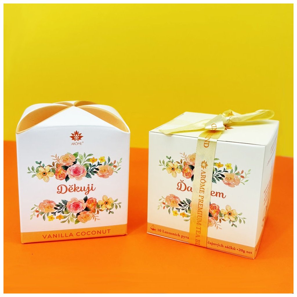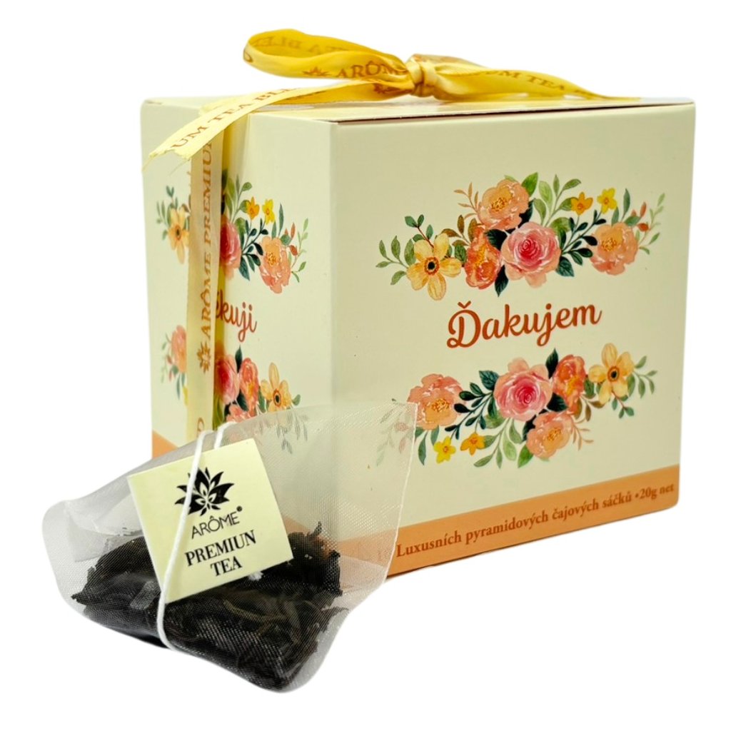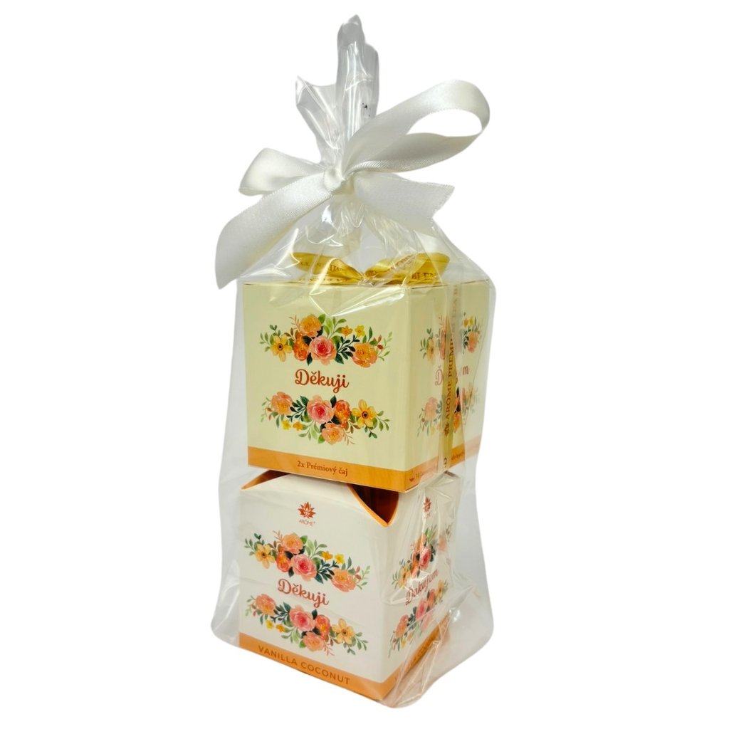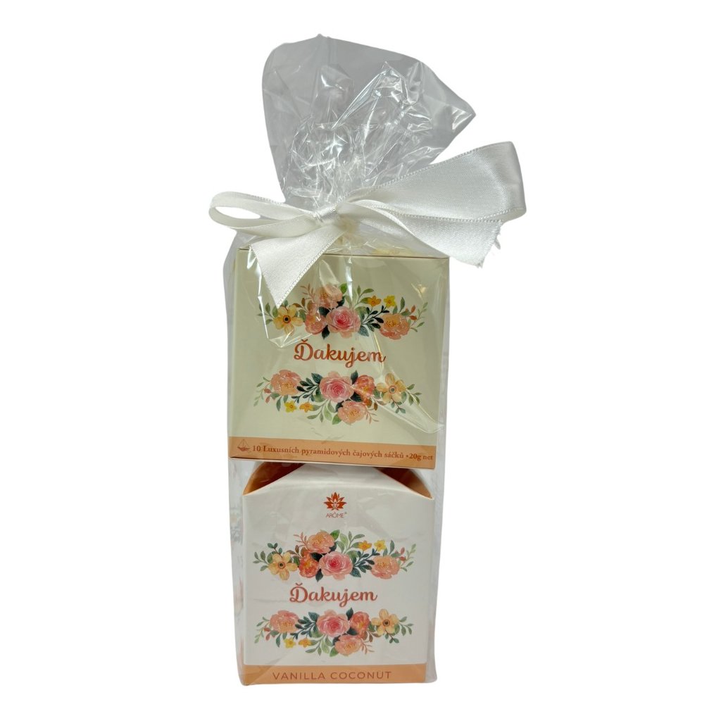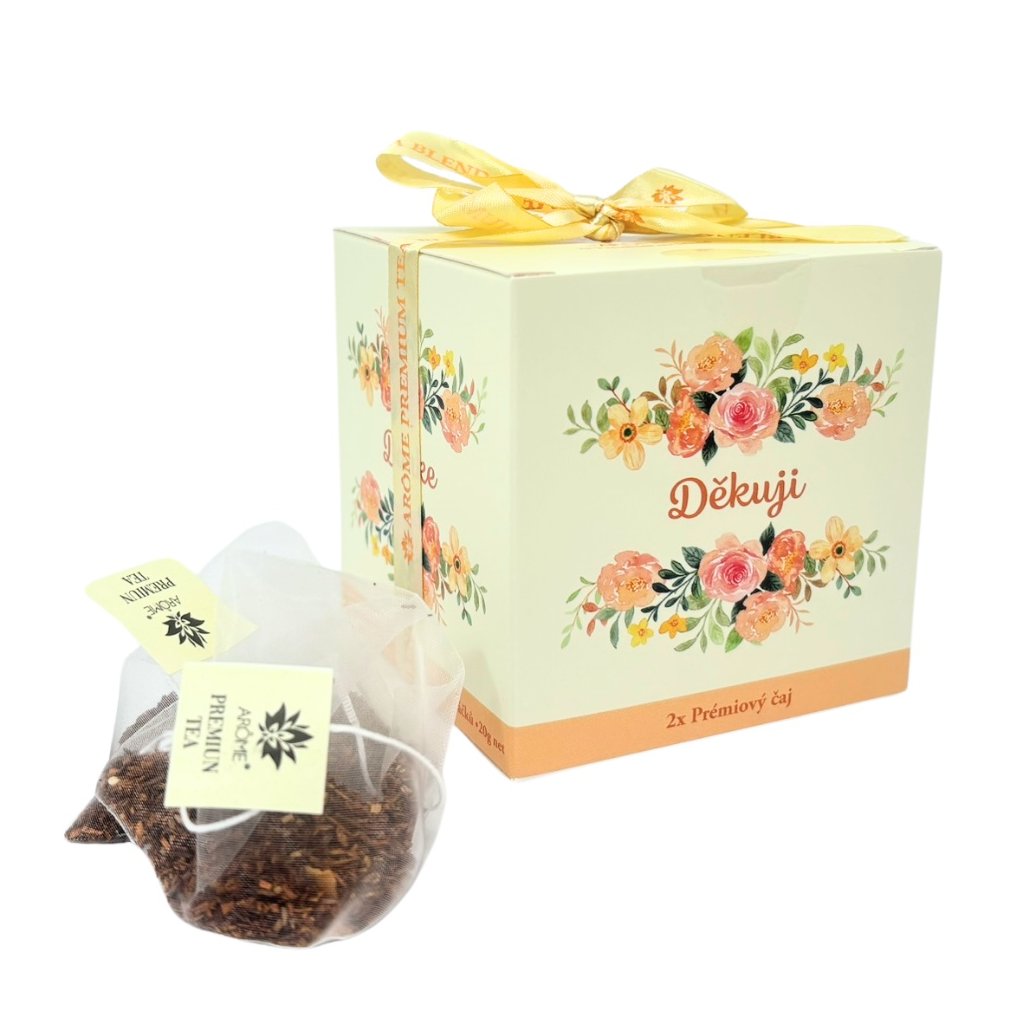 - Lahodný zelený čaj zo Srí Lanky. Dve príchute po 5 vrecúšok - harmanček a citronela, čučoriedka a bazový kvet. Vo farebnej papierovej škatuľke s nápisom Ďakujem.