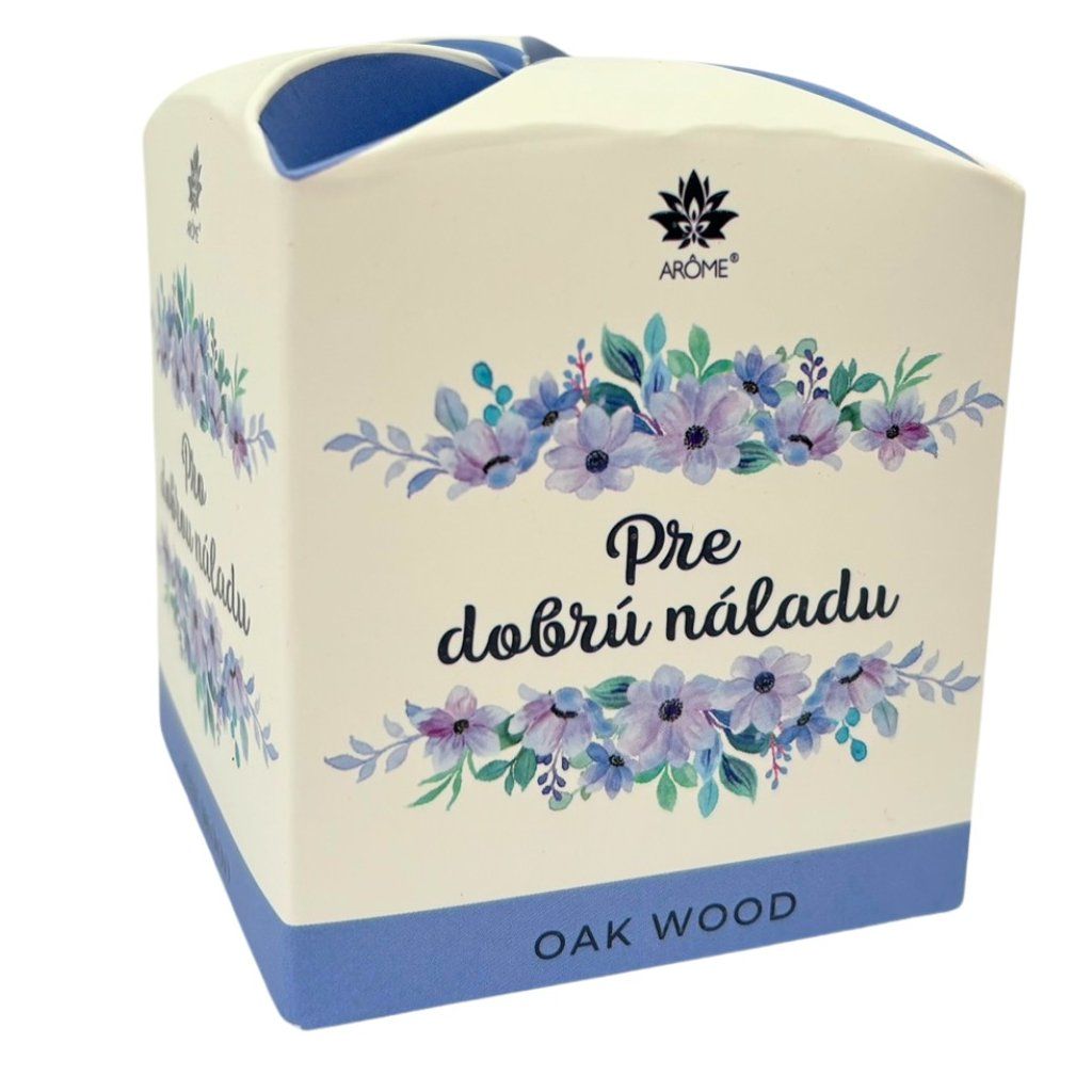Vonná sviečka v skle zabalená v krásnej papierovej škatuľke v tvare kvetu s nápisom „Pre dobrú náladu“. Hmotnosť 90 g, doba horenia 22 hodín. Vôňa dubového dreva.