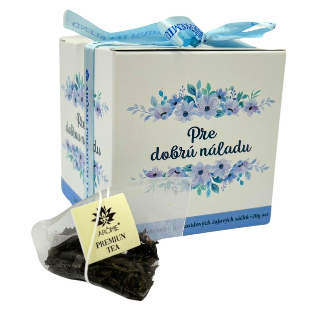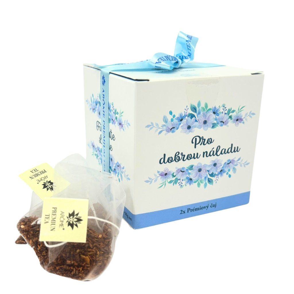 Darčeková súprava s nápisom Pre dobrú náladu obsahuje vonnú sviečku a lahodnú čajovú súpravu. Darčekové balenie.