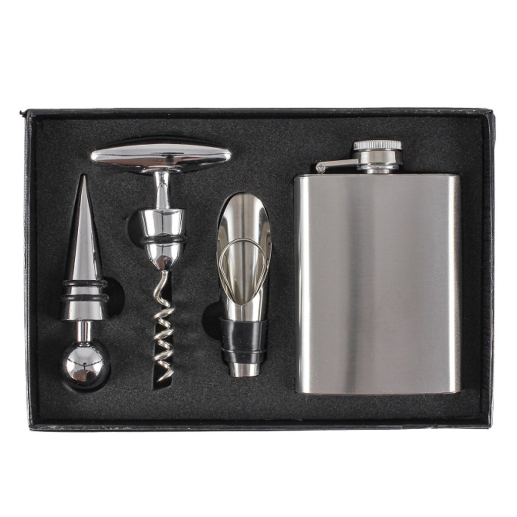 Táto štýlová darčeková súprava je vynikajúcim nápadom na darček. Ploskačka má klasický dizajn s nízkou hmotnosťou na jednoduchú a pohodlnú prepravu. Súčasťou je aj praktická vývrtka, nálevka a zátka. Skvelá súprava ako darček pre milovníkov dobrého vína.