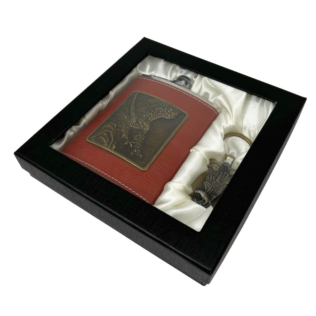 Darčeková súprava s nerezovou ploskačkou a príveskom na kľúče. Zdobená lietajúcim orlom.