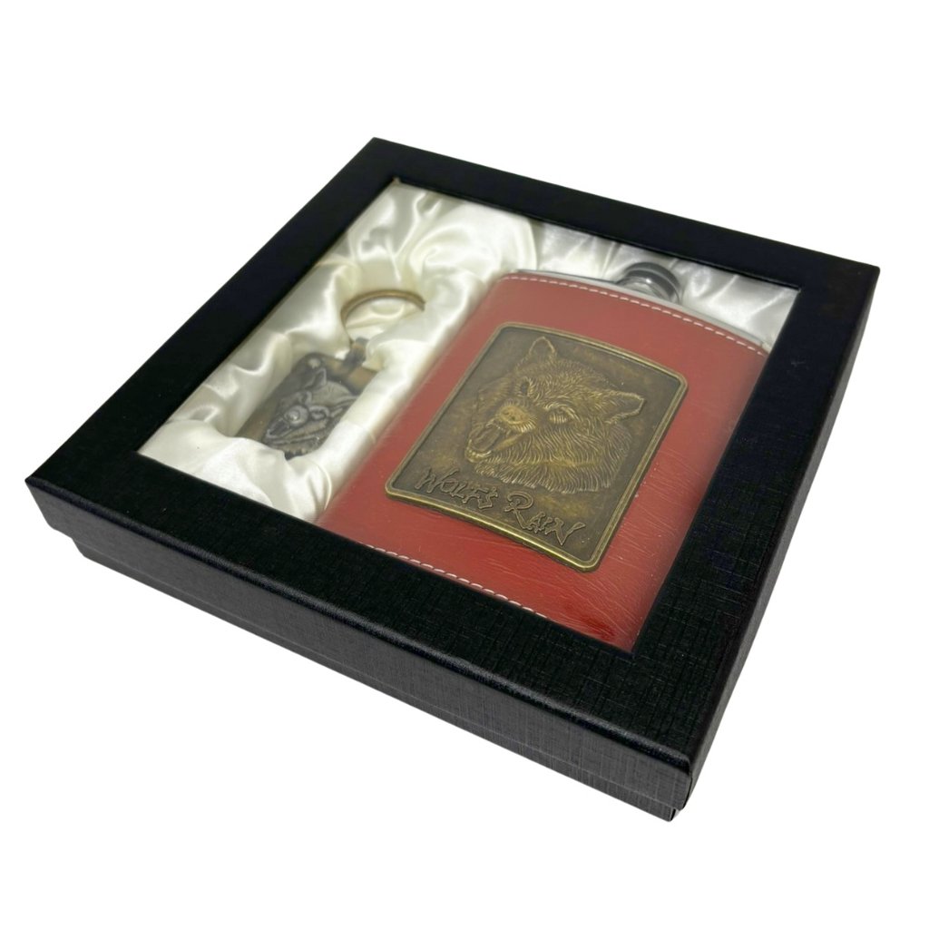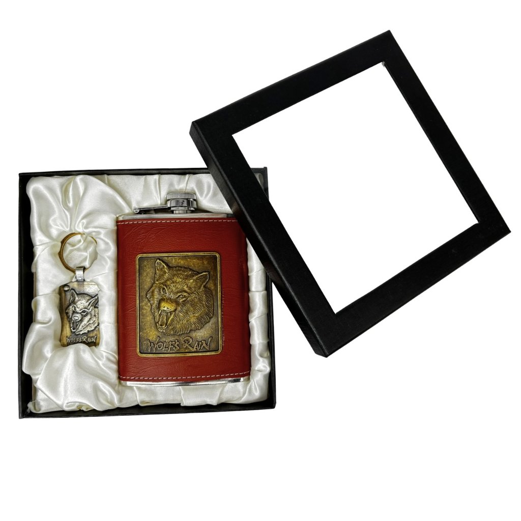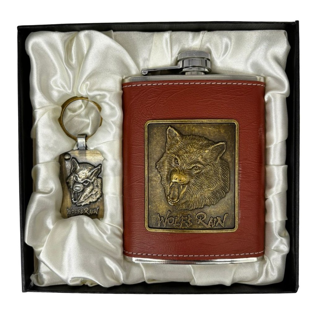 Darčeková súprava s nerezovou ploskačkou a príveskom na kľúče. Zdobená hlavou vlka.