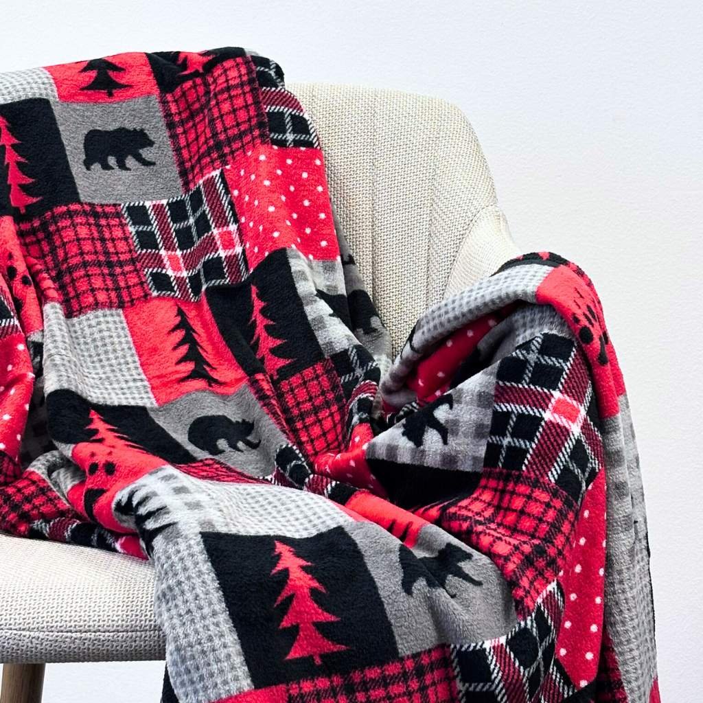 Mäkká, hrejivá a zároveň ľahká mikroflanelová deka v atraktívnom modernom károvanom vzore. Na farebnom pozadí sú medvedie labky, medvede, stromy, bodky a bloky.