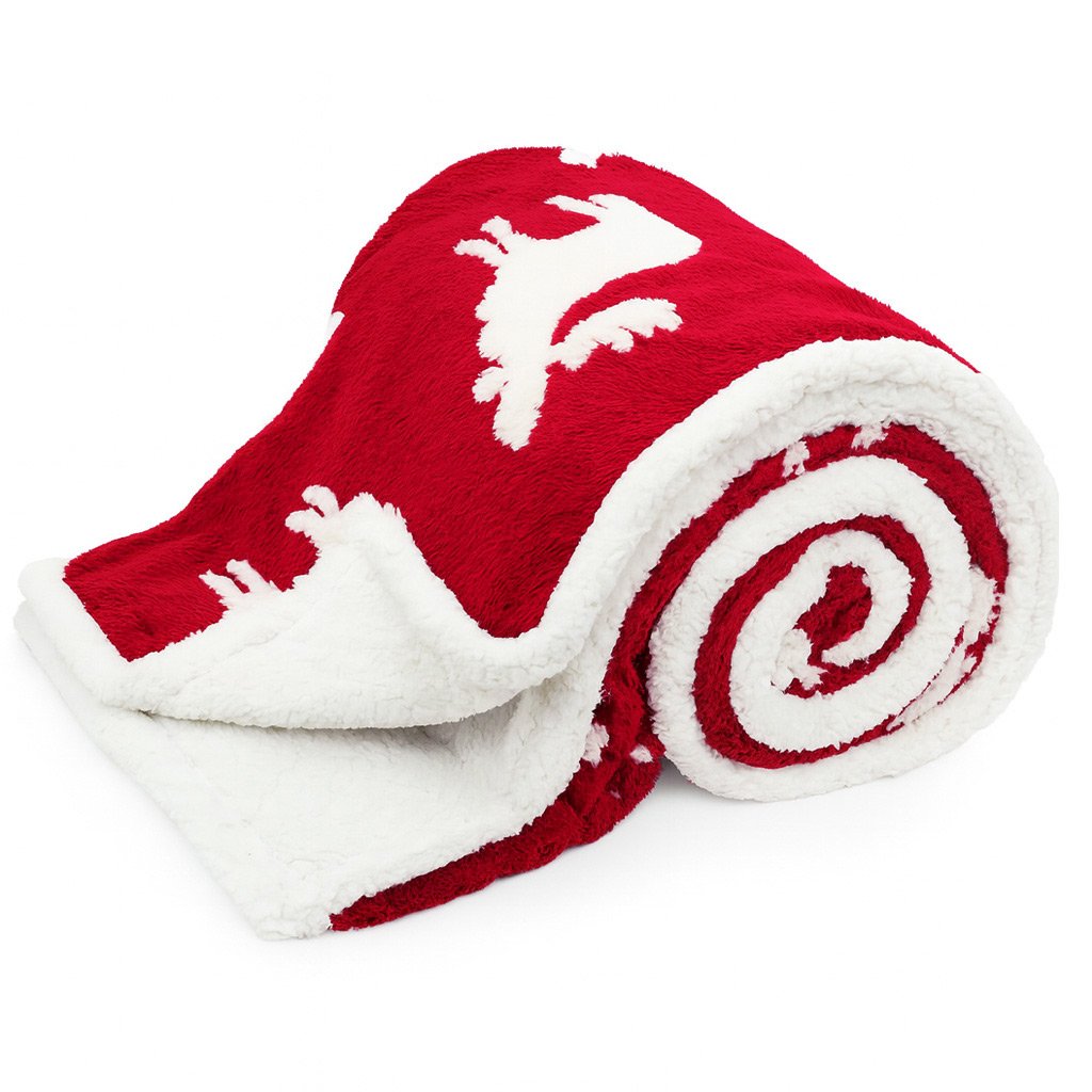 Deka má krásny žakárový vzor bielych losov na červenom podklade, pričom baránok je v bielej farbe.