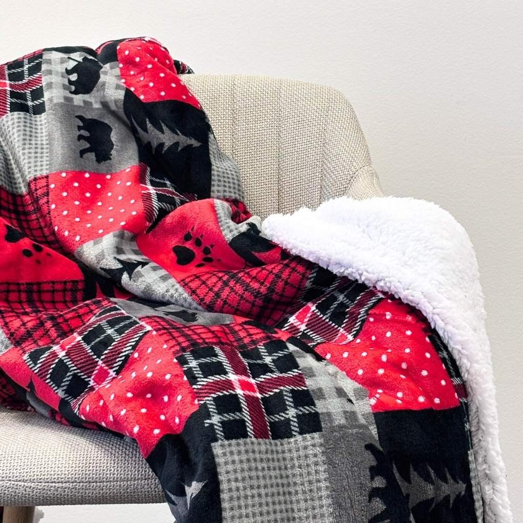 Z jednej strany deku zdobí atraktívny moderný káro vzor pripomínajúci patchwork v tmavočervenej, čiernej, sivej a bielej farbe s motívmi medvedích labiek, medveďov, stromov a bodiek.
