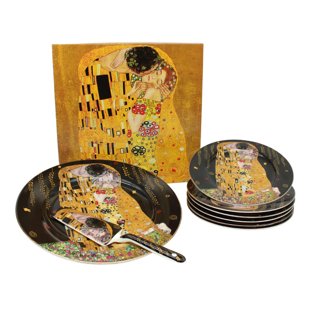 Oslava narodenín, svadba alebo dokonca výročie svadby sa nezaobíde bez krásnej torty. Pri týchto vzácnych príležitostiach vám nesmie chýbať veľký tortový tanier s naberačkou a servírovacími taniermi. Na štýlovom luxusnom tanieri zdobenom slávnym obrazom Bozk od Gustava Klimta bude torta vyzerať skvele uprostred prestretého stola.
