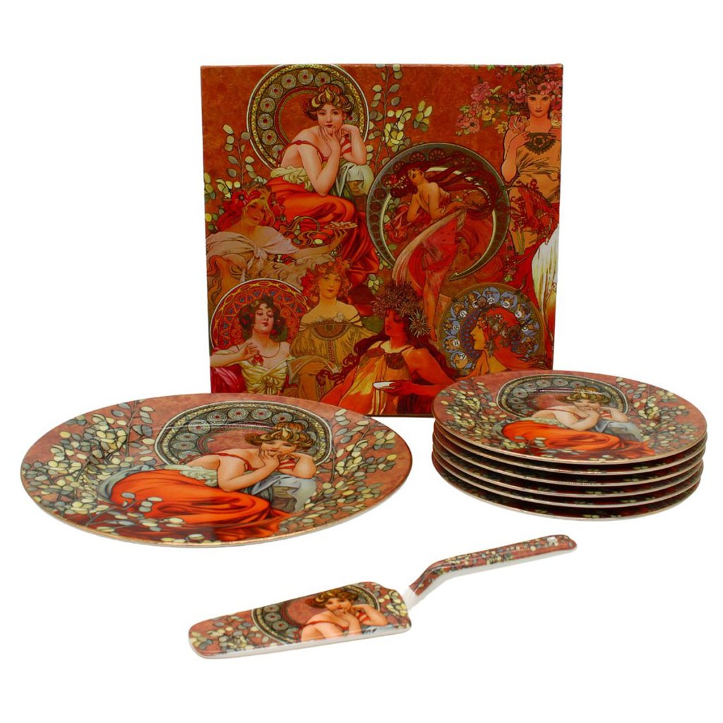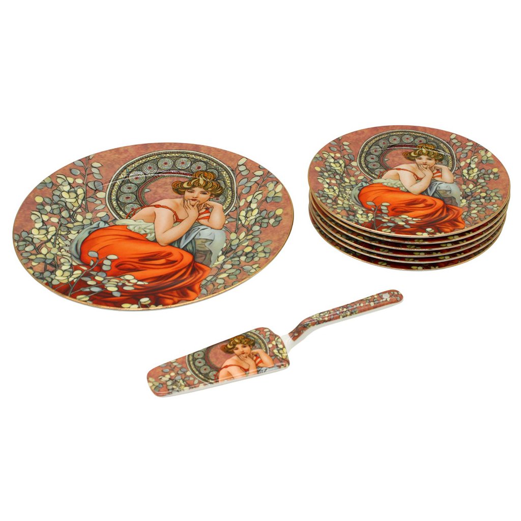Oslava narodenín, svadba alebo dokonca výročie svadby sa nezaobíde bez krásnej torty. Pri týchto vzácnych príležitostiach vám nesmie chýbať veľký tortový tanier s naberačkou a servírovacími taniermi. Na štýlovom luxusnom tanieri zdobenom slávnym obrazom od Alfonsa Muchu bude torta vyzerať skvele uprostred prestretého stola.