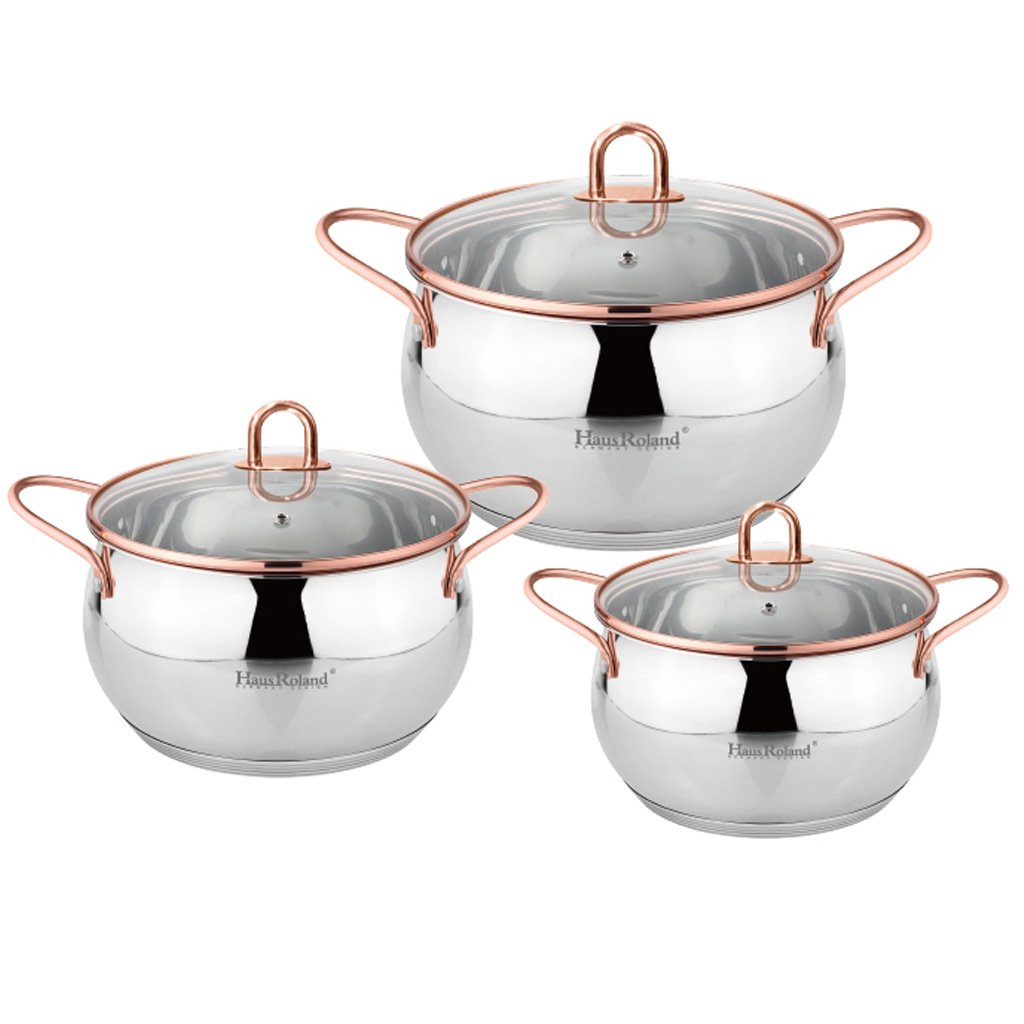 Súprava moderných nerezových hrncov so sklenenými pokrievkami s otvormi na odvod pary je vhodná pre všetky typy sporákov vrátane indukcie. Elegantný dizajn hrncov v kombinácii lesklého povrchu a medených komponentov umožňuje pekné servírovanie priamo na stole. Hrnce sú vyrobené z prvotriednej nehrdzavejúcej ocele a majú sendvičové dno pre rovnomerný a rýchly ohrev. Špeciálne tvarované okraje uľahčujú nalievanie bez rozstrekovania. Vďaka skleneným pokrievkam máte prehľad o tom, čo sa v hrnci deje.