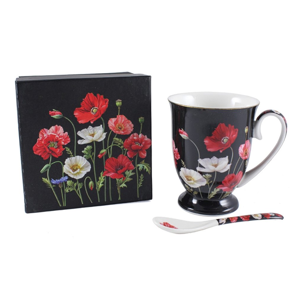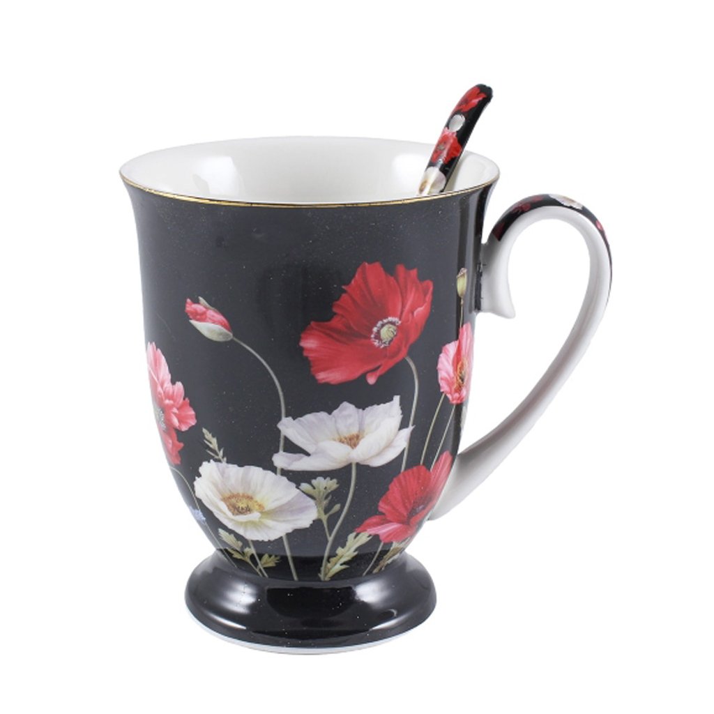 Krásny čierny porcelánový hrnček s lyžičkou zdobený červenými a bielymi makmi. Hrnček je vhodný na čaj, kávu, viedenskú kávu alebo horúcu čokoládu. Nápoj z takéhoto hrnčeka si naozaj vychutnáte. Hrnček je súčasťou kolekcie vlčie maky, takže ho môžete ľahko kombinovať s inými podobnými výrobkami.
