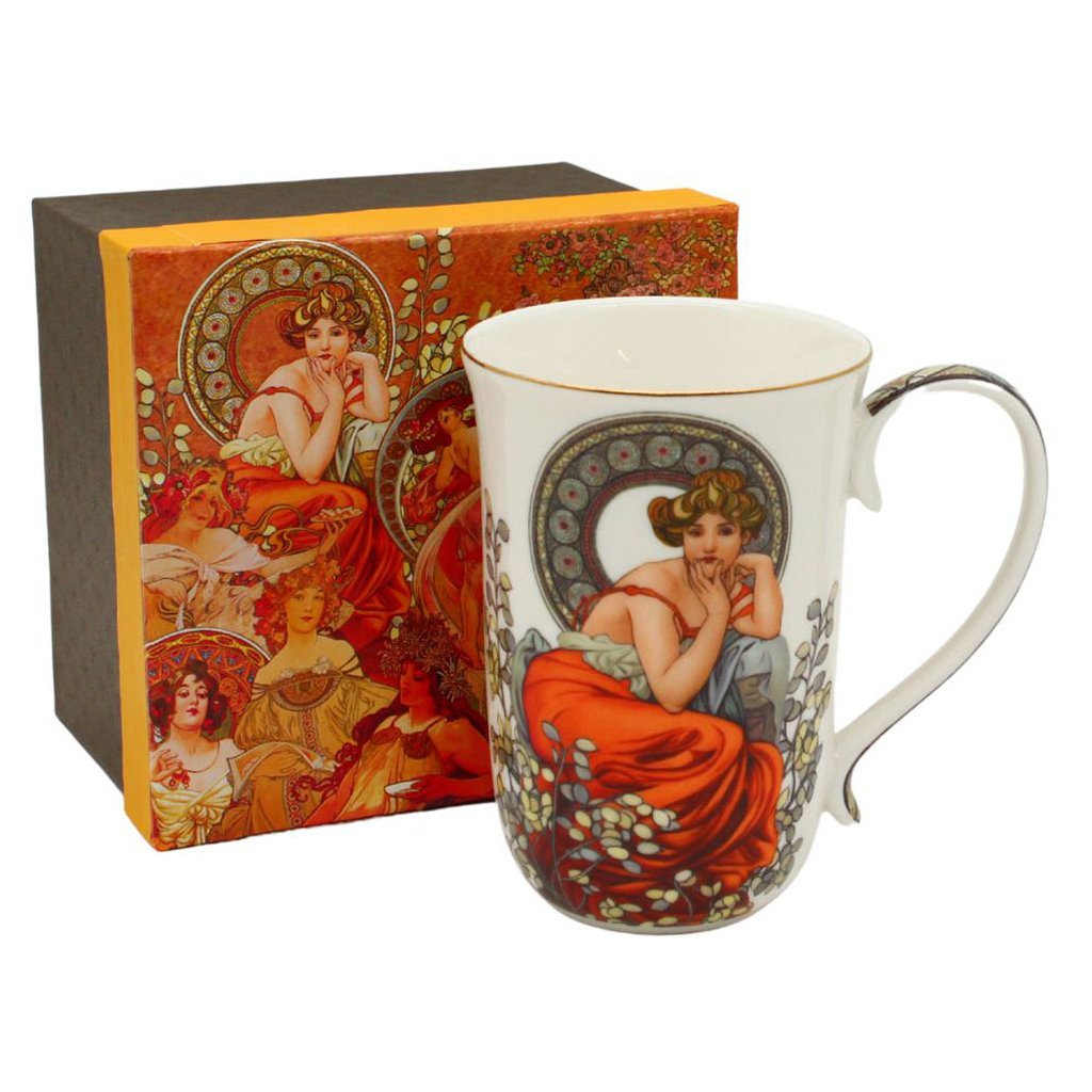 Exkluzívne dielo maliara Alfonsa Muchu na porcelánovom hrnčeku, ktorý je ideálny na čaj, viedenskú kávu alebo dokonca horúcu čokoládu.