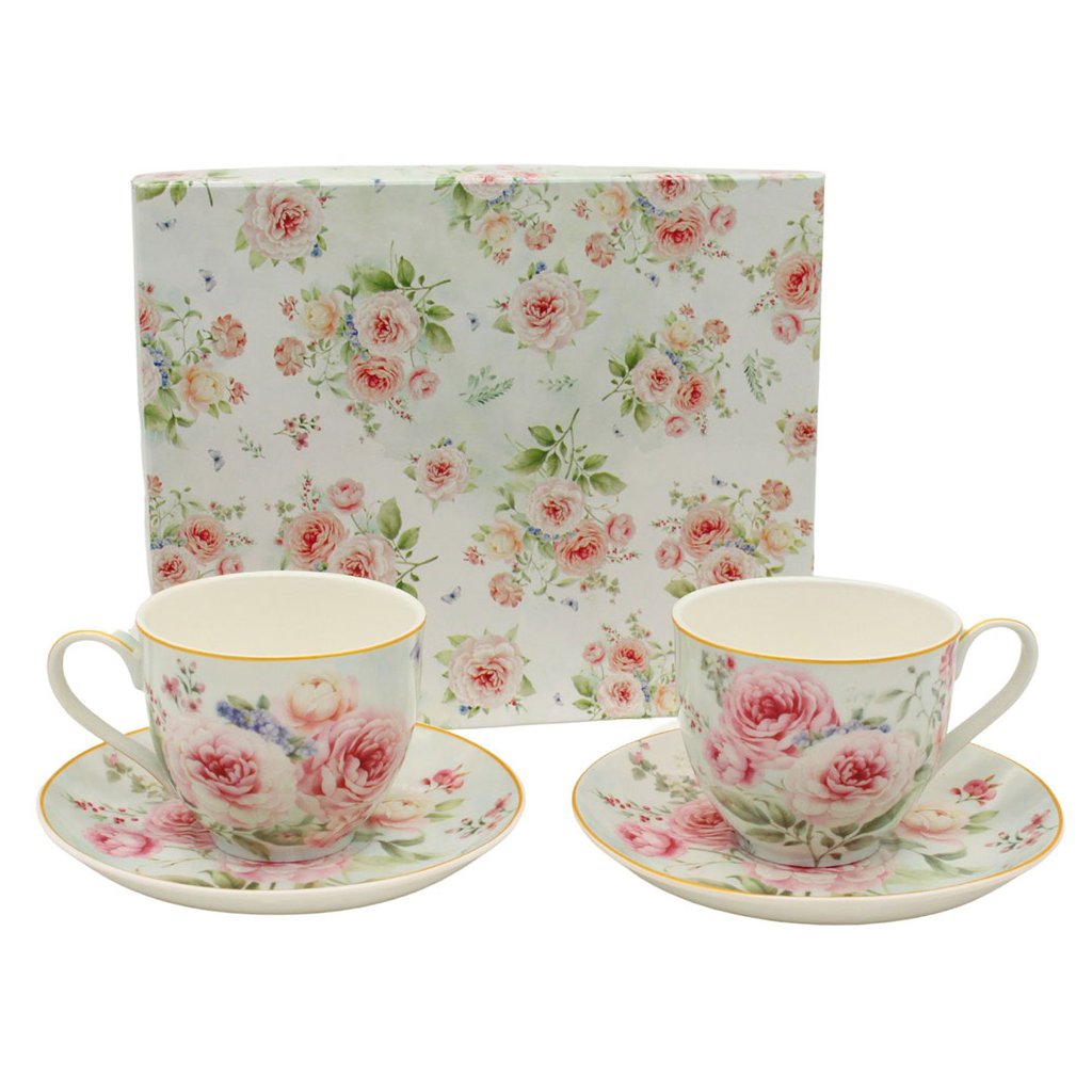 Dve elegantné romantické porcelánové šálky a podšálky s jemným dekorom kvetov ruží pre chvíle pohody. S krásnym hrnčekom si raňajky alebo popoludňajší čaj naozaj vychutnáte.