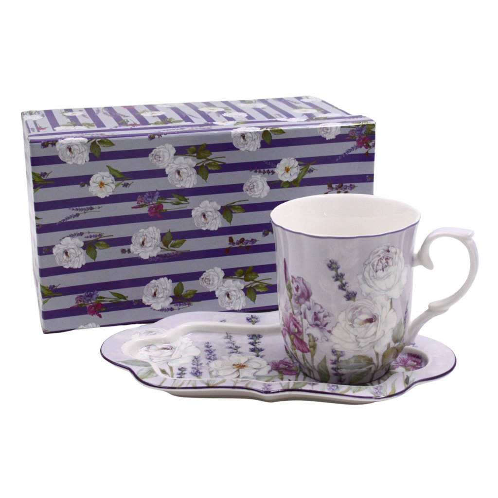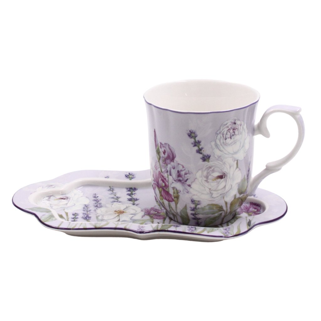 Porcelánový hrnček s objemom 360 ml jemne zdobený levanduľou a väčší podšálok v rovnakom dizajne. Praktický tácka je veľmi užitočný na servírovanie, na pochúťky, dezerty, občerstvenie alebo ovocie. Ak ho chcete darovať ako darček, nemusíte sa starať o balenie, pretože je zabalený v peknej darčekovej škatuľke.