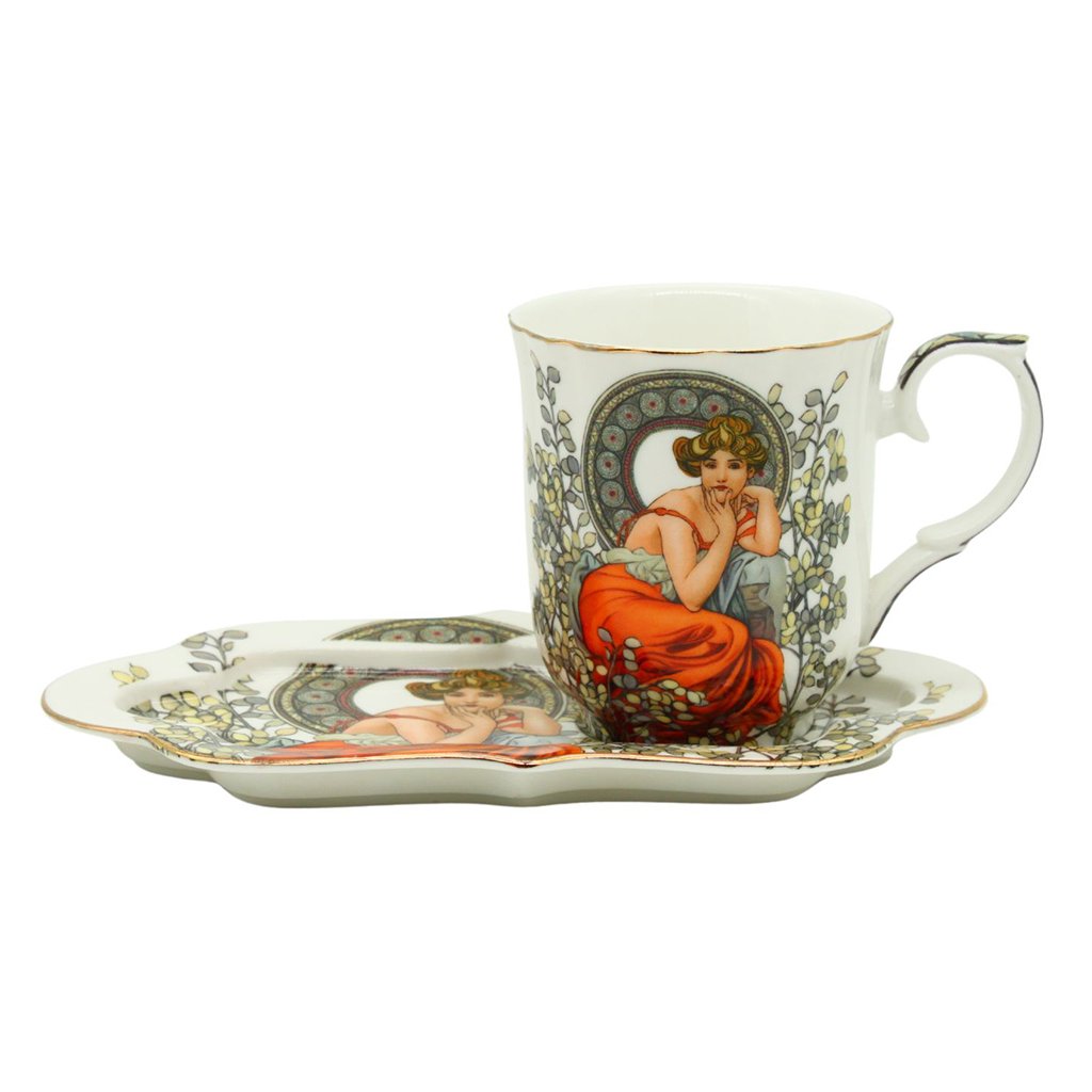 Porcelánový hrnček 360 ml na čaj alebo iný nápoj s väčším podšálkom. Dekor z diela Alfonsa Muchu vo svetlom odtieni.