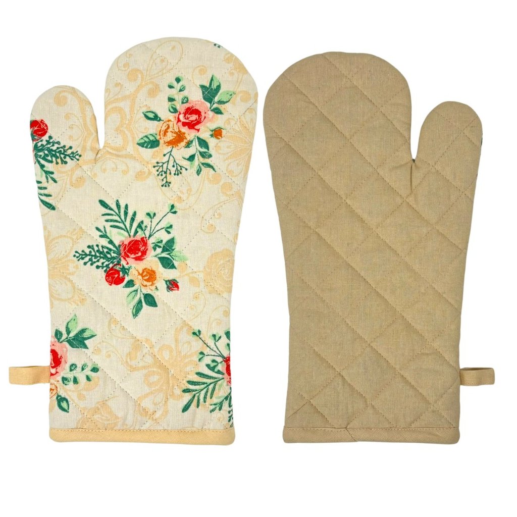 Chňapka je na jednej strane potlačená kvetmi a ornamentmi a na druhej strane je béžová. Chňapka má všitý magnet a tiež pútko na zavesenie podľa potreby.